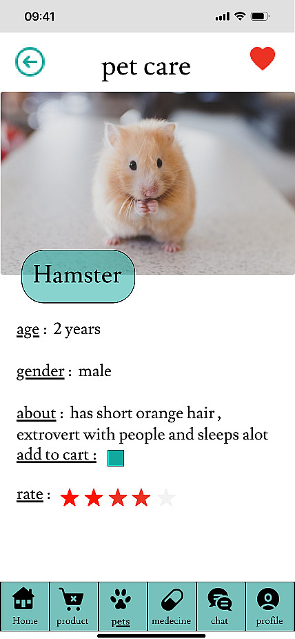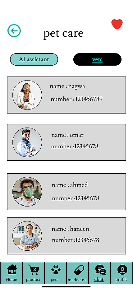 قمت بتصميم واجهة وتجربة مستخدم لتطبيق موبايل متخصص في العناية بالحيوانات الأليفة،