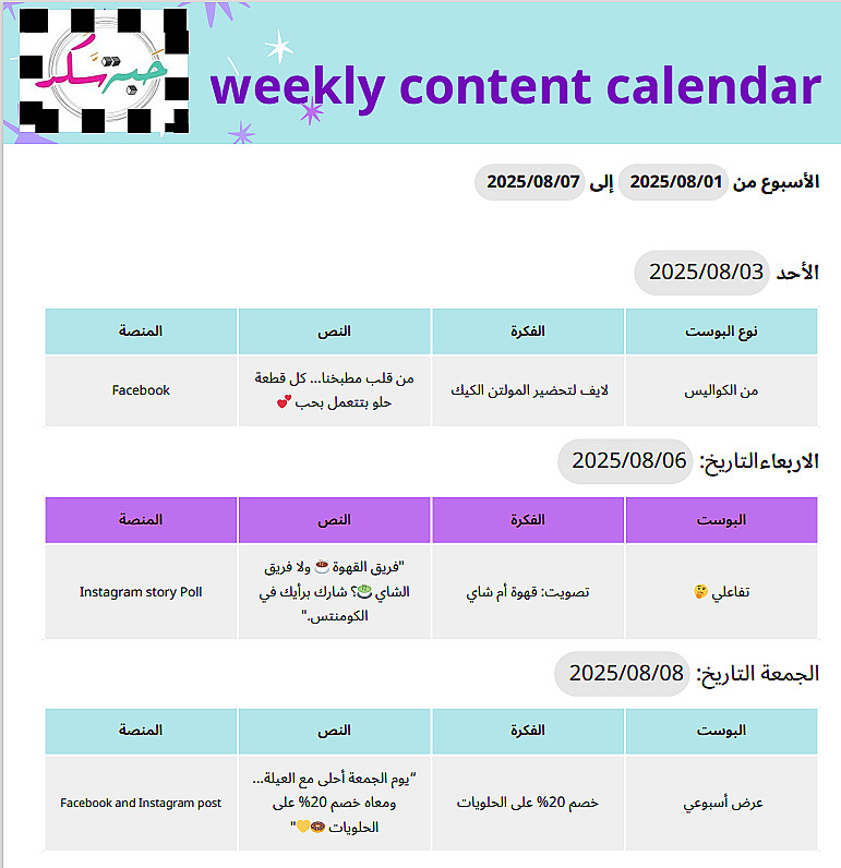 أقدم خدمة تصميم كالندر أسبوعي او شهري منظم واحترافي يساعدك على إدارة مهامك اليومية وتخطيط أعمالك بشكل مرن وفعّال. سواء كنت صاحب مشروع، طالب، أو شخص يبحث عن تنظيم وقته، الكالندر الأسبوعي سيكون أداة مثالية لتسهيل متابعة الأولويات والالتزامات.