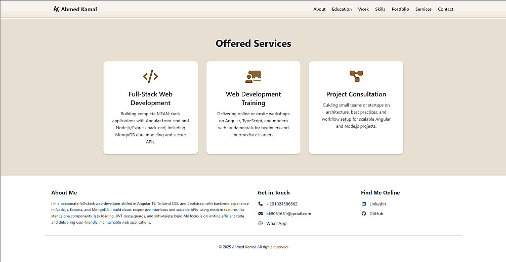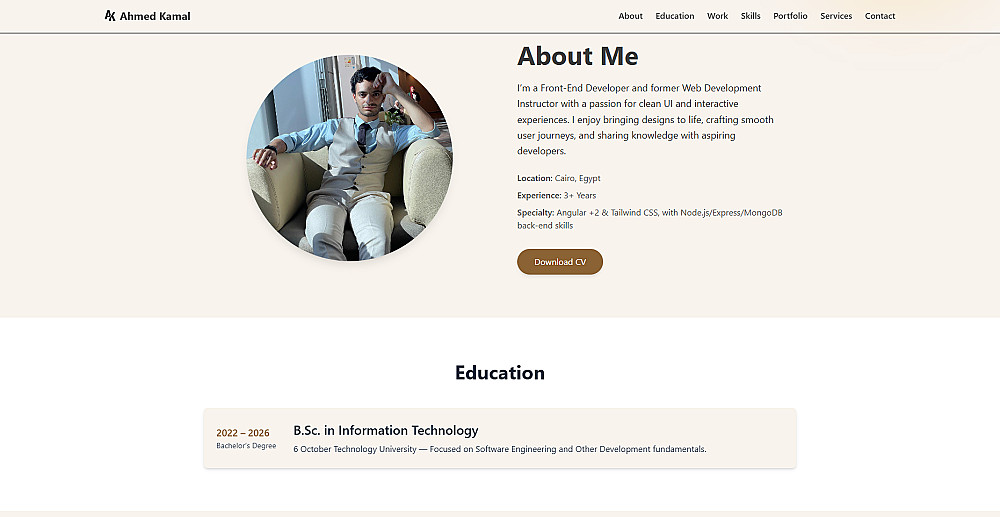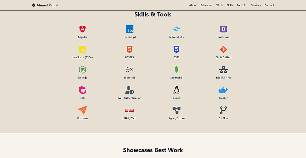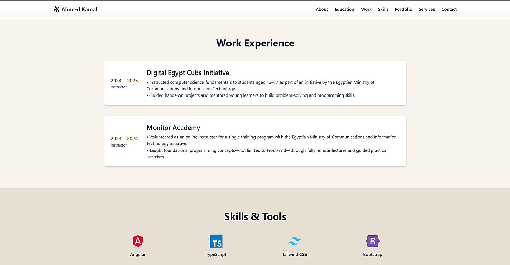 أستخدم في عملي أحدث تقنيات الويب مثل HTML, CSS, Bootstrap، وTailwind CSS أو Angular لبناء تصميم أنيق وسريع ومتوافق مع جميع الأجهزة (موبايل – تابلت – كمبيوتر).