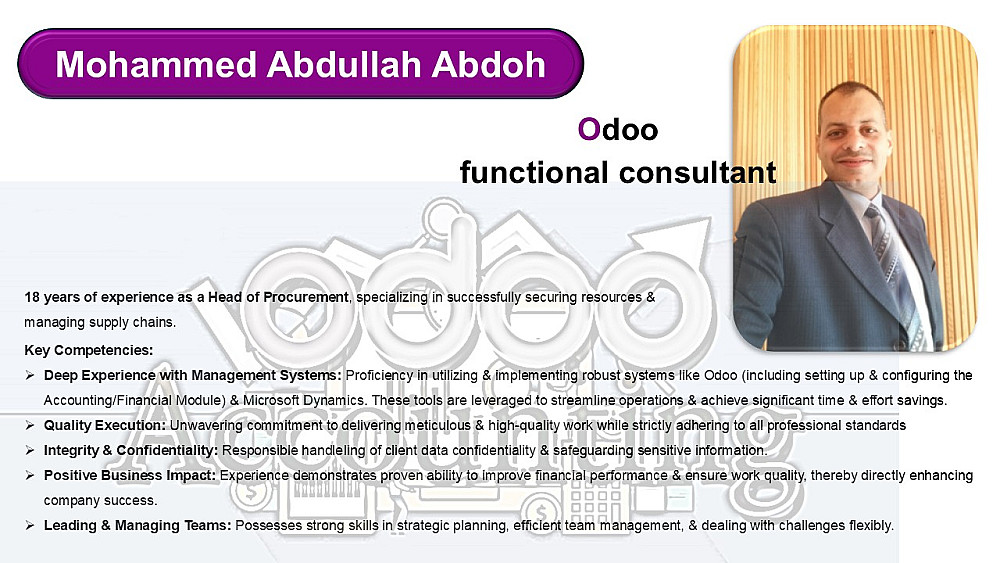 مستشار وظيفي لنظام أودوو الاحترافي وتنفذ النظام المحاسبي لـ Odoo