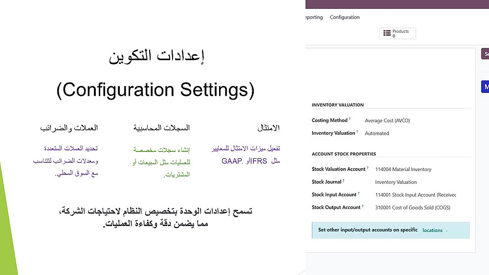 * تهيئة وتكوين نظام أودوو المحاسبي بطريقة احترافية تتوافق مع المعايير المحلية والدولية.