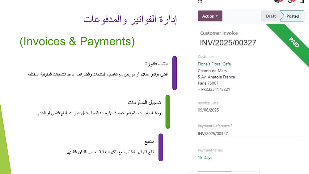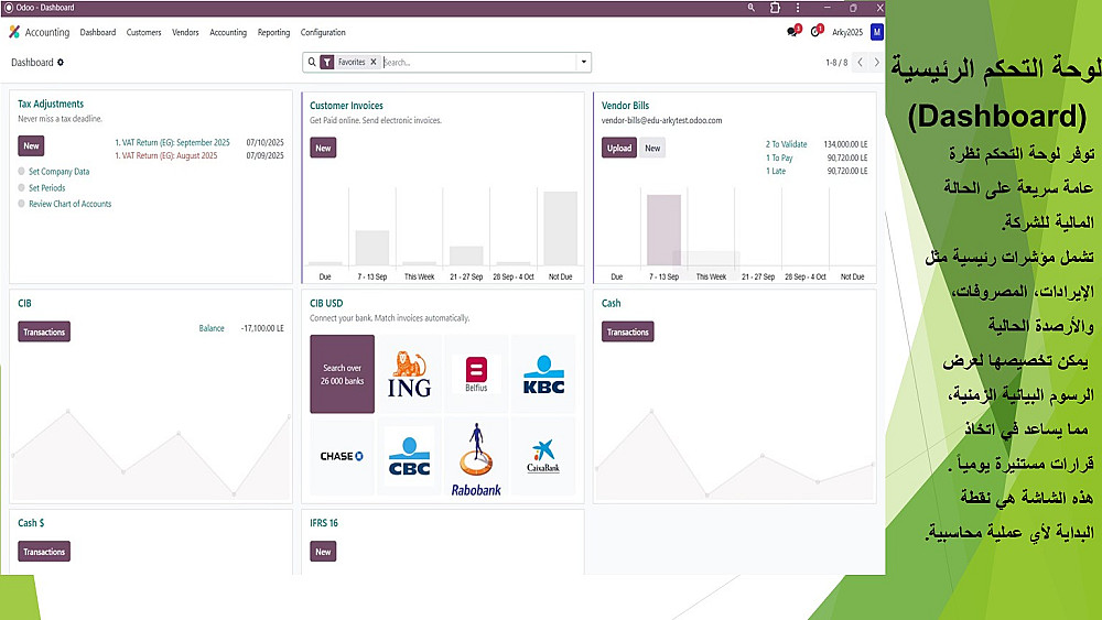 تمكينك من إدارة العمليات المالية بكفاءة وشفافية، وضمان امتثالها للمعايير المحاسبية، عبر توظيف الإمكانيات القوية لنظام Odoo بأفضل صورة ممكنة.