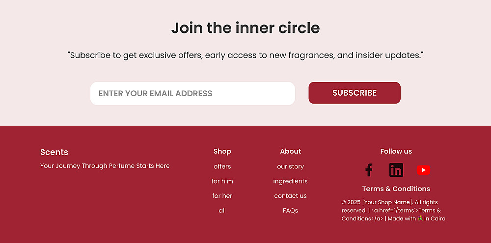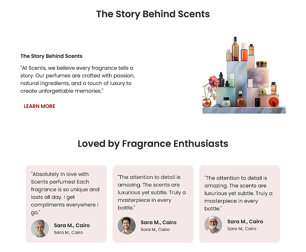 الصفحة بتكون متجاوبة (Responsive) مع كل الأجهزة، وبتصميم حديث يعكس هوية البراند ويقدّم تجربة استخدام بسيطة وسلسة.