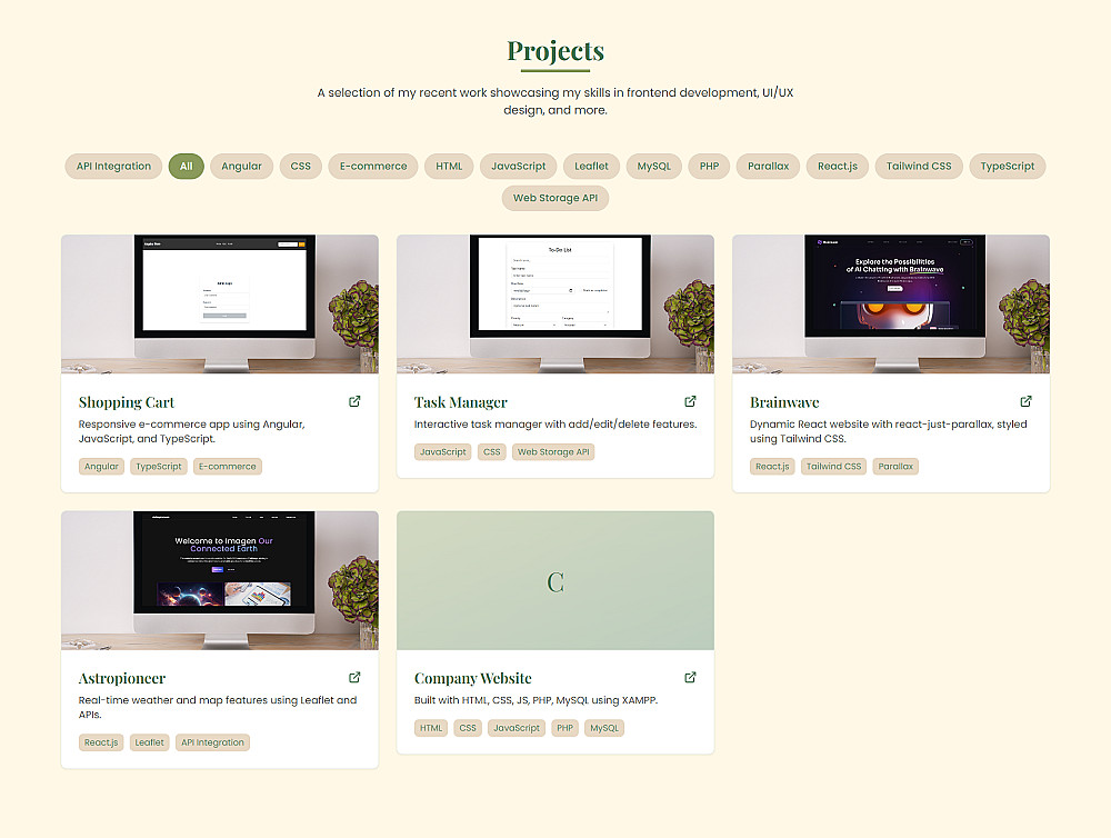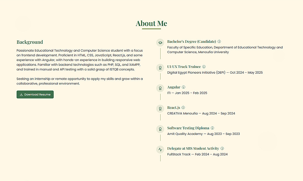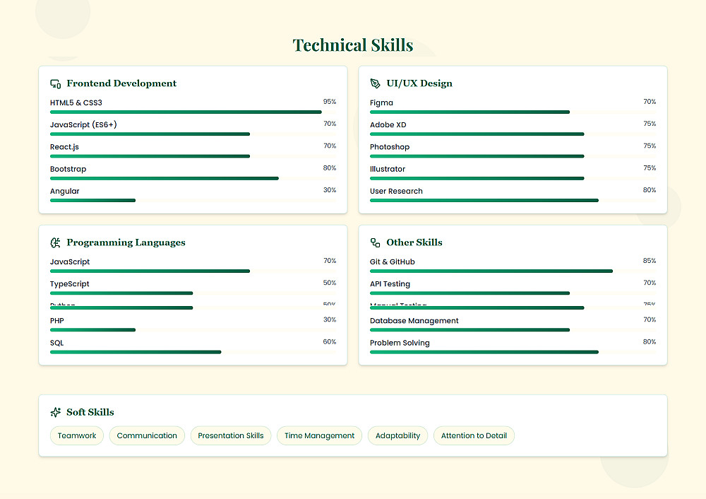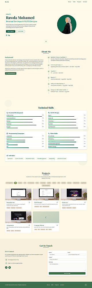 - خبرة في تطوير واجهات أمامية (Front-End) حديثة باستخدام HTML, CSS, و JavaScript.
