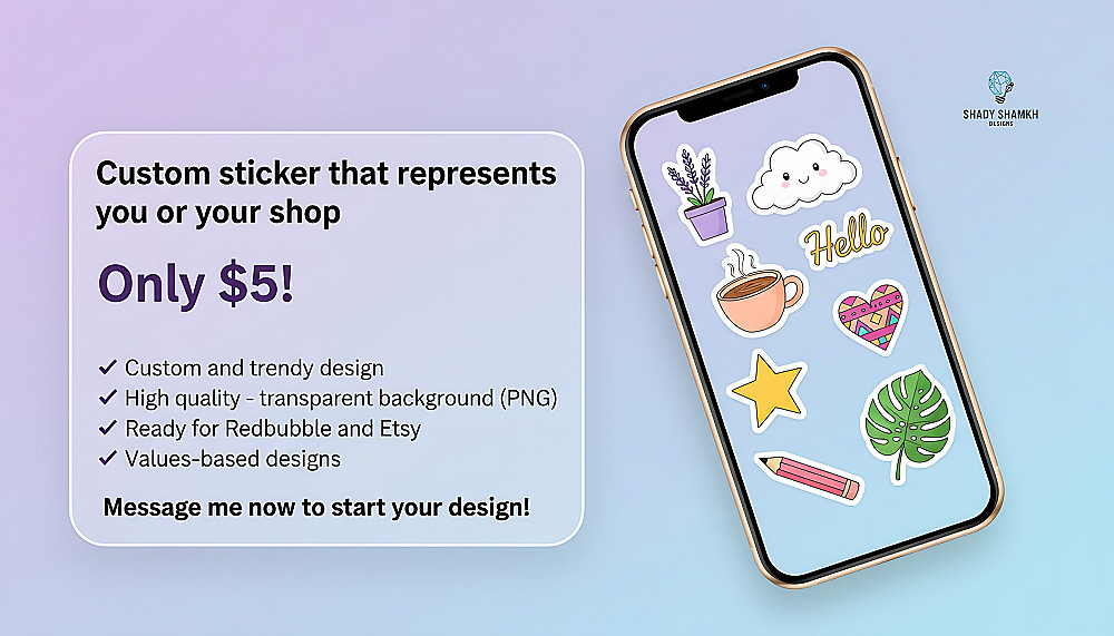 سأصمم لك استيكر مخصص مقابل 5 دولار فقط بجودة عالية وصيغة PNG بخلفية شفافة، مناسب للطباعة أو الاستخدام على Redbubble – Etsy – Teespring.