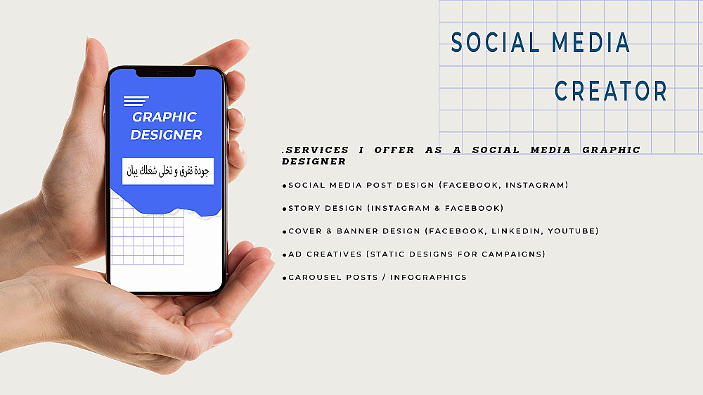 في هذه الخدمة سأصمم لك بوستات احترافية وعصرية مصممة خصيصًا لتناسب جمهورك ونشاطك التجاري، بهدف زيادة التفاعل وتعزيز صورتك البصرية على المنصات المختلفة.