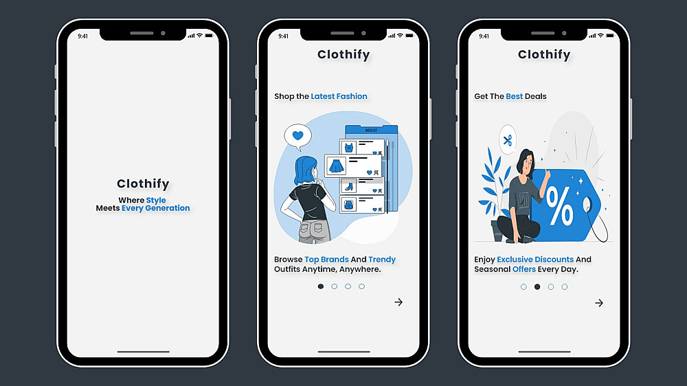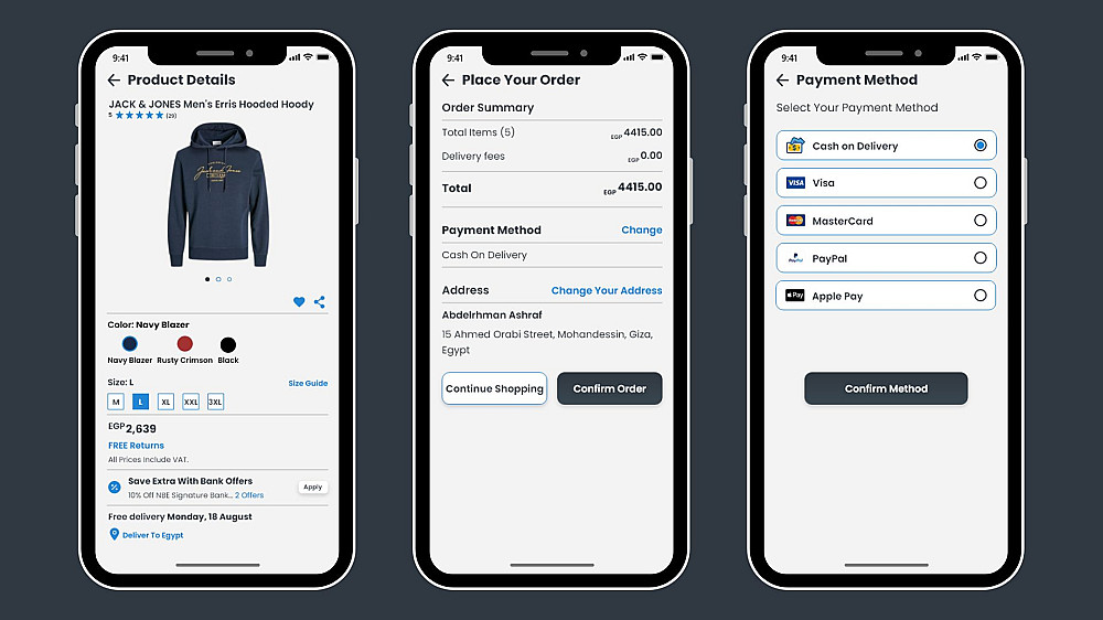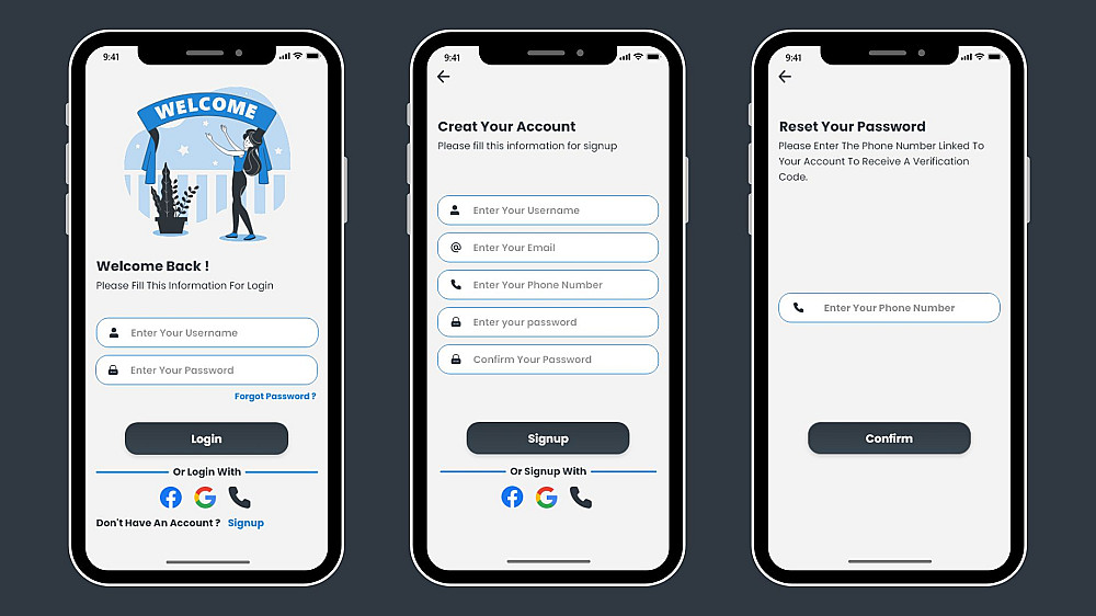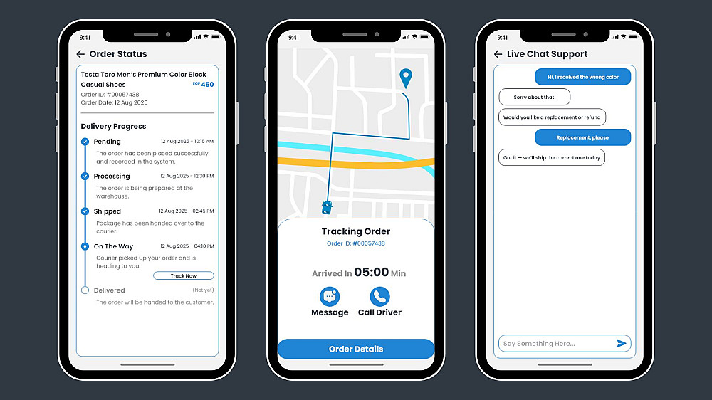 تصميم 3 شاشات لتطبيق موبايل (Android أو iOS).