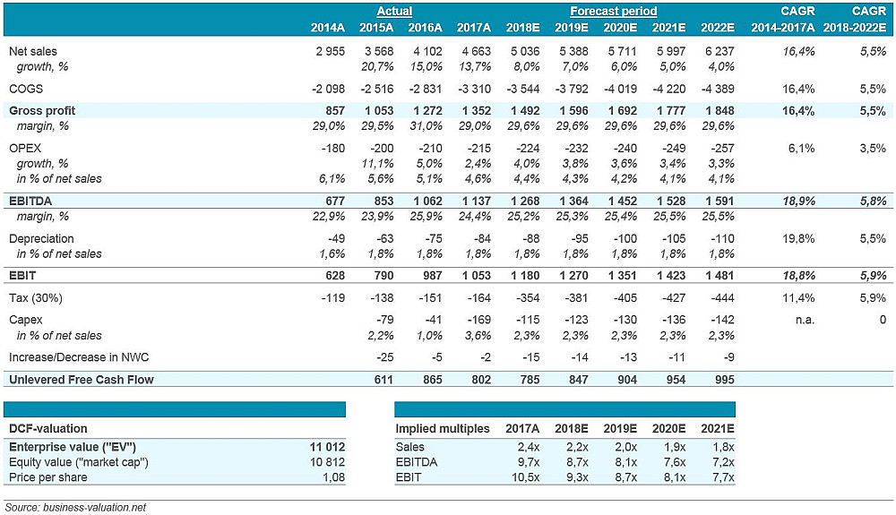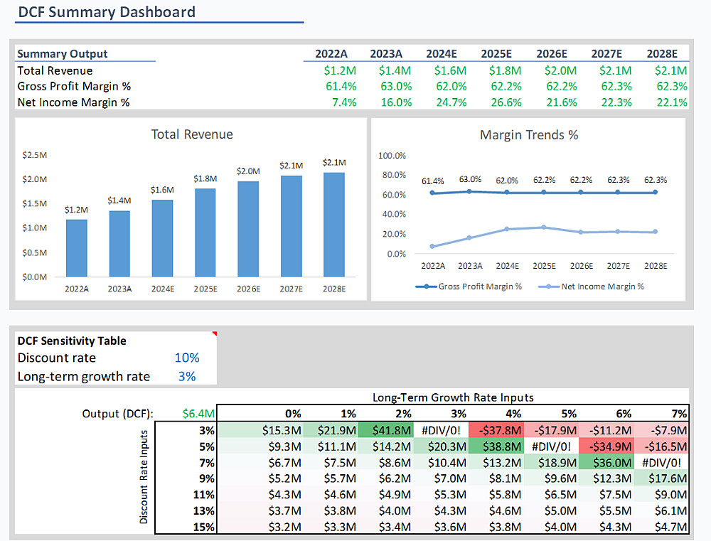 يشمل النموذج تحليل DCF لتقدير القيمة الجوهرية، وتحليل الحساسية لتقييم تأثير معدلات الخصم والنمو.
