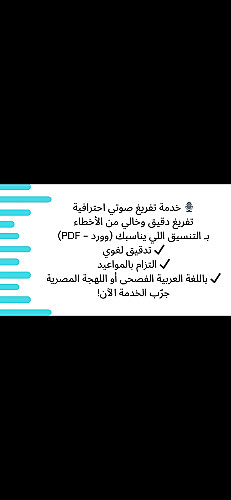 أنا أقدّم خدمة تفريغ صوتي احترافي من الملفات الصوتية أو الفيديوهات، مع تنسيق النص بعناية تامة.