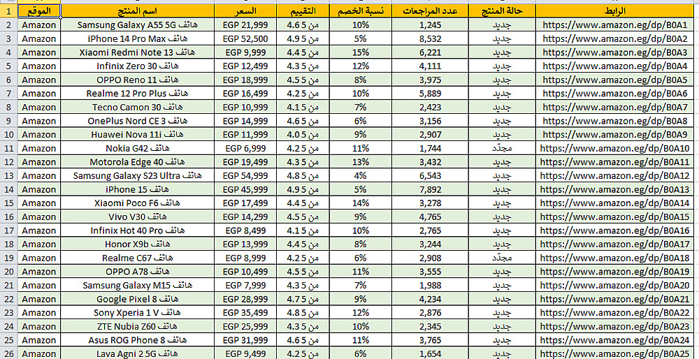 • جمع بيانات المنتجات من المتاجر الإلكترونية (الاسم، السعر، الصور، الروابط...).