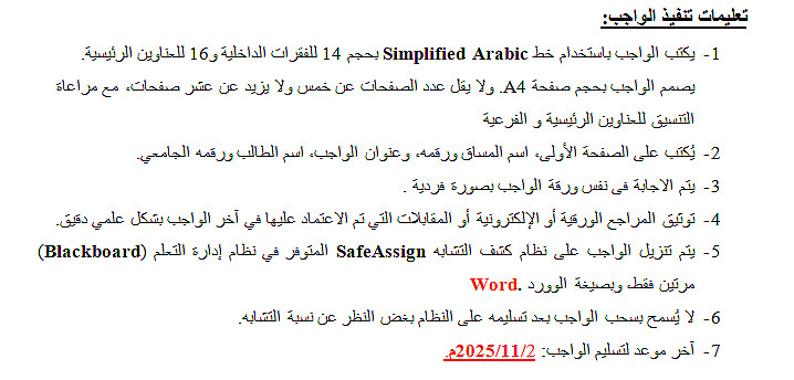 أقدّم لك خدمة مخصصة لكتابة وإعداد جميع أنواع الواجبات العملية، التقارير، الأبحاث والدراسات التطبيقية وفق أحدث ضوابط الجامعة ومتطلباتها، تشمل: