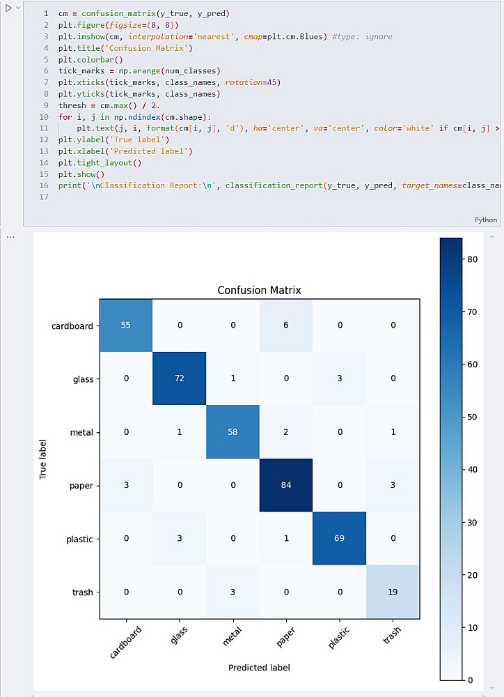 قمت سابقًا ببناء نموذج لتصنيف أنواع النفايات باستخدام EfficientNetB0، حيث حقق دقة اختبار تصل إلى 90%، مع رسم منحنيات الدقة ومصفوفة الالتباس لتحليل الأداء.