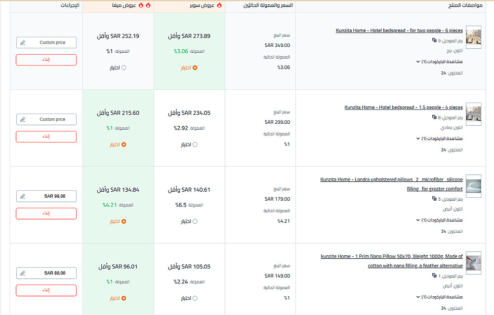 4-تسعير وتكليف المنتجات مع القيمة الضريبية وعمولة ترنديول ل(5منتجات)