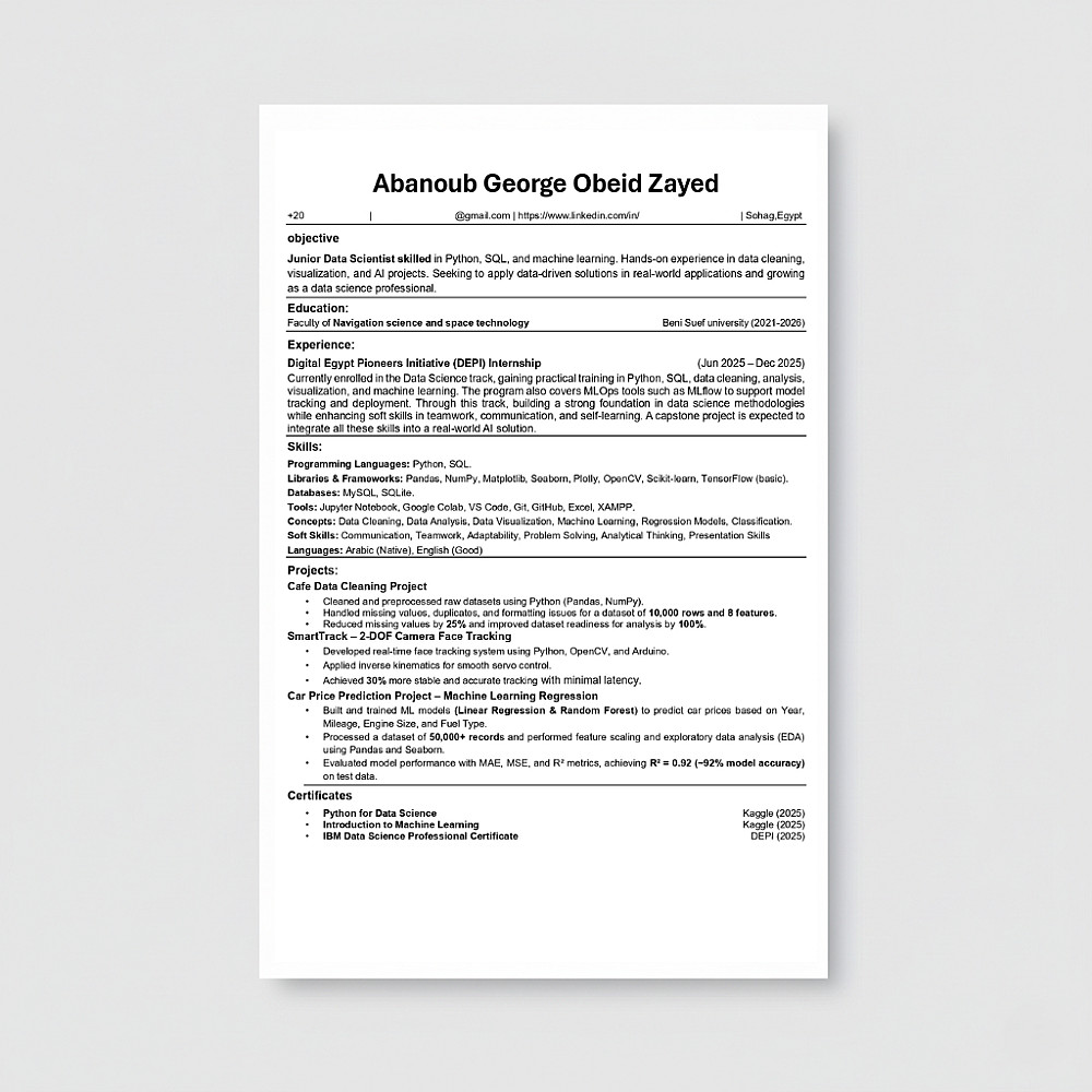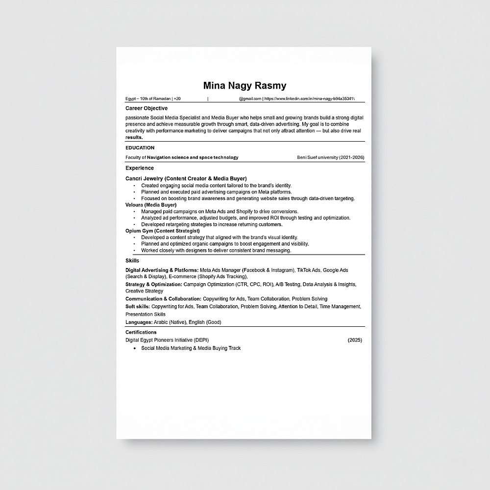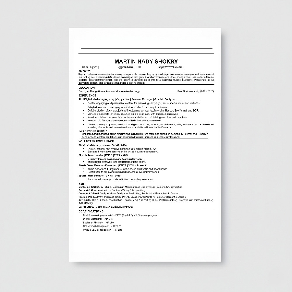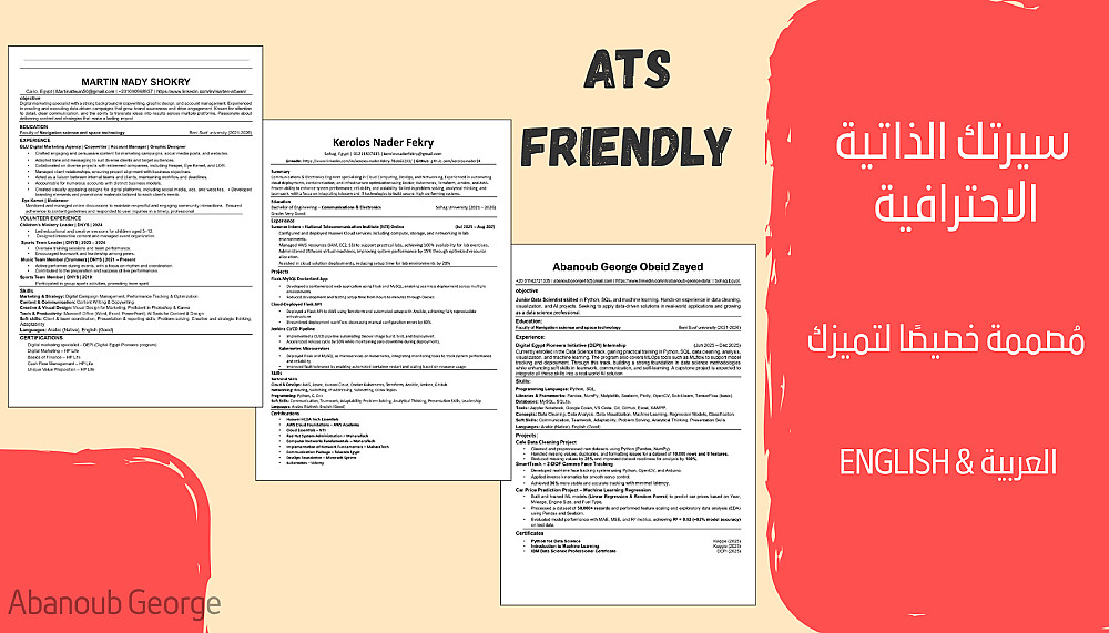 أقدّم خدمة إعداد وتصميم سيرة ذاتية احترافية متوافقة مع معايير الـ ATS (Applicant Tracking System) لضمان أن يتم قراءتها من قِبل أنظمة التوظيف بشكل صحيح وتصل إلى مسؤولي التوظيف.