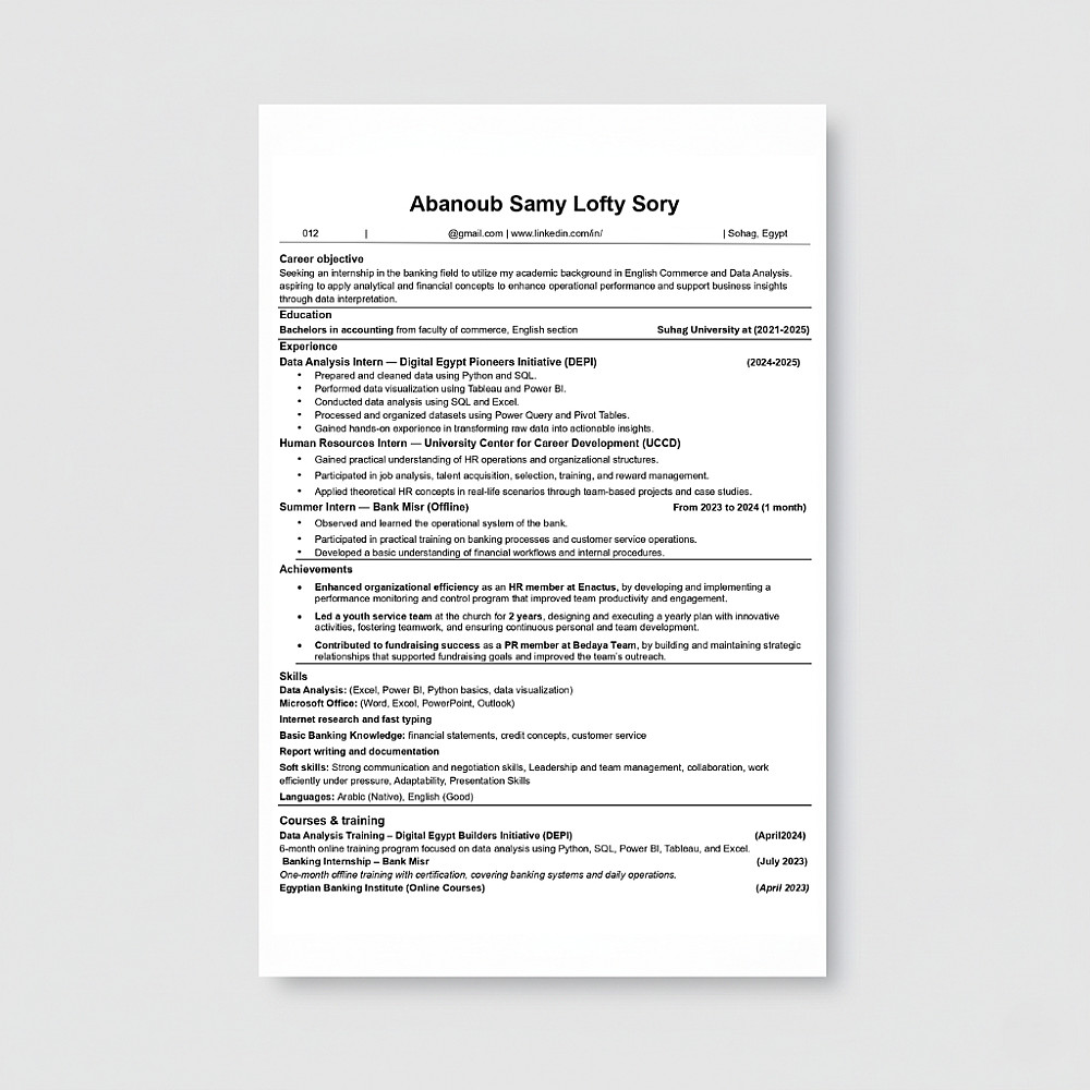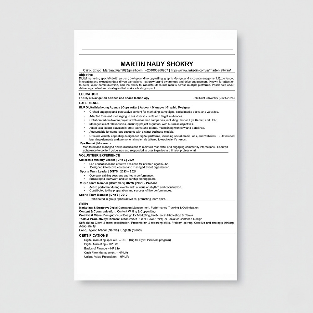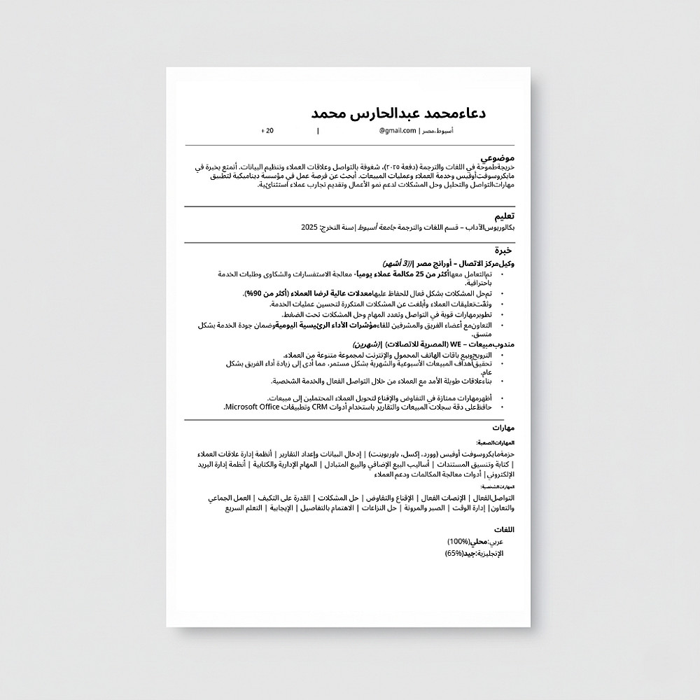 ضمان التوافق الكامل مع نظام ATS: سأستخدم أدق الكلمات المفتاحية وأفضل التنسيقات التي تمكن سيرتك الذاتية من تجاوز أنظمة الفرز الآلي (ATS) بنسبة 100%، مما يزيد من فرص وصول سيرتك إلى القائمة النهائية للمرشحين.