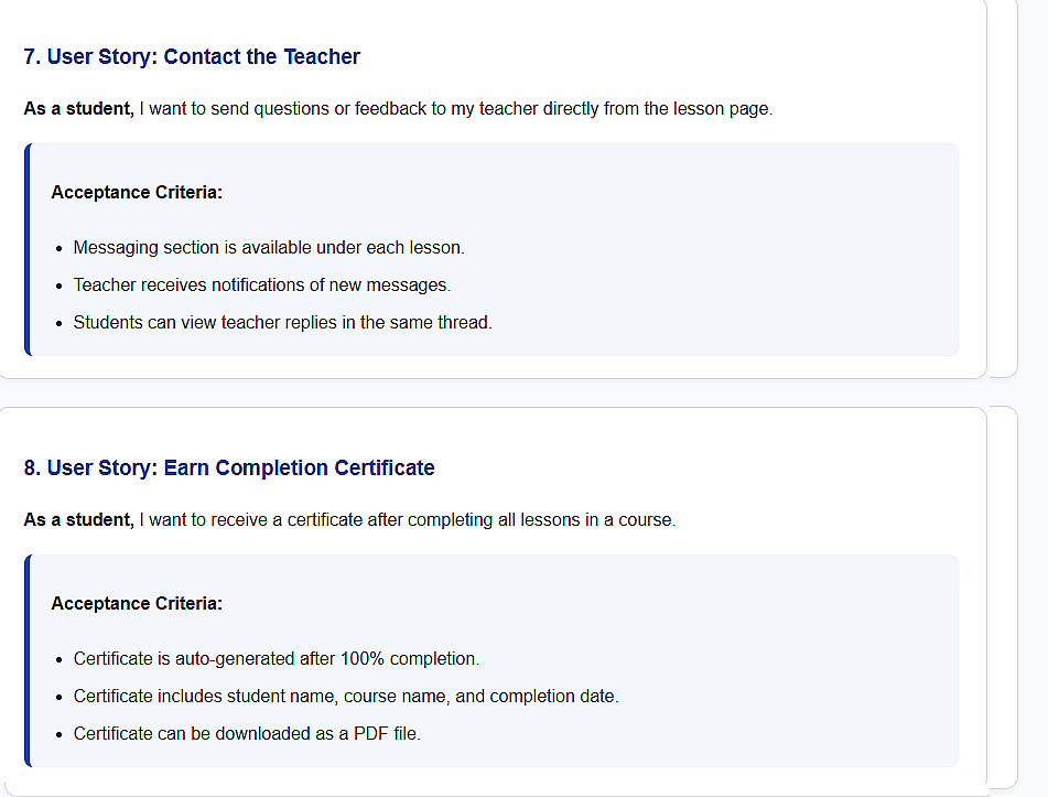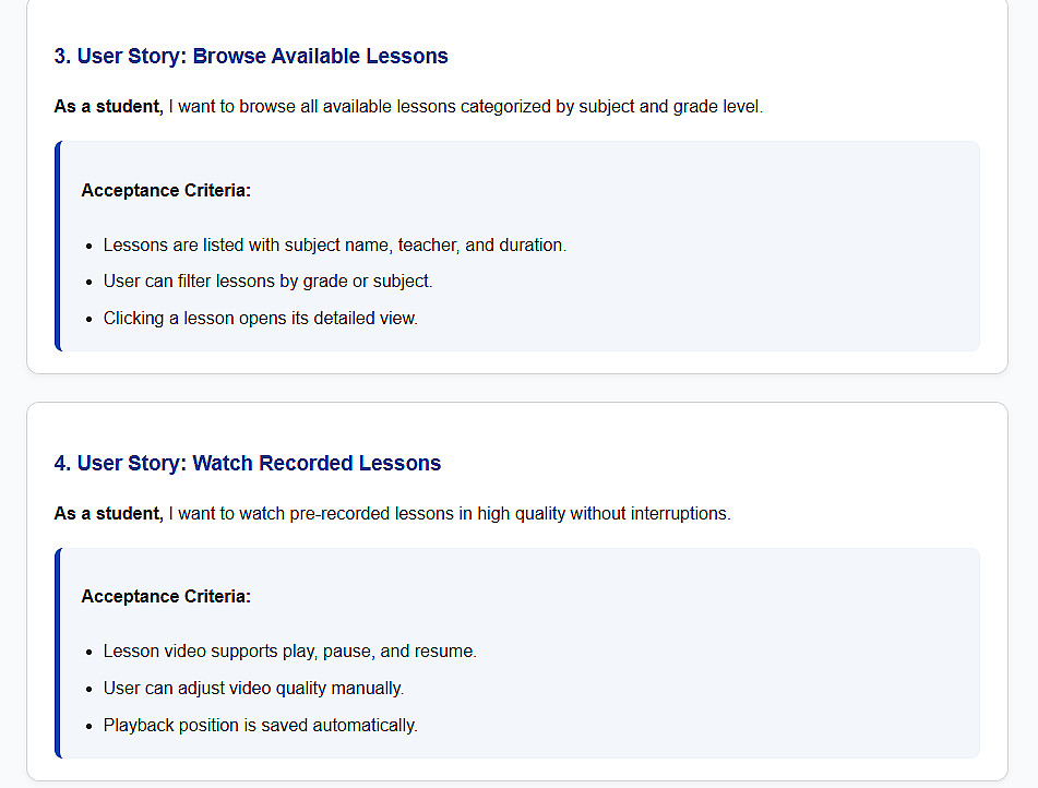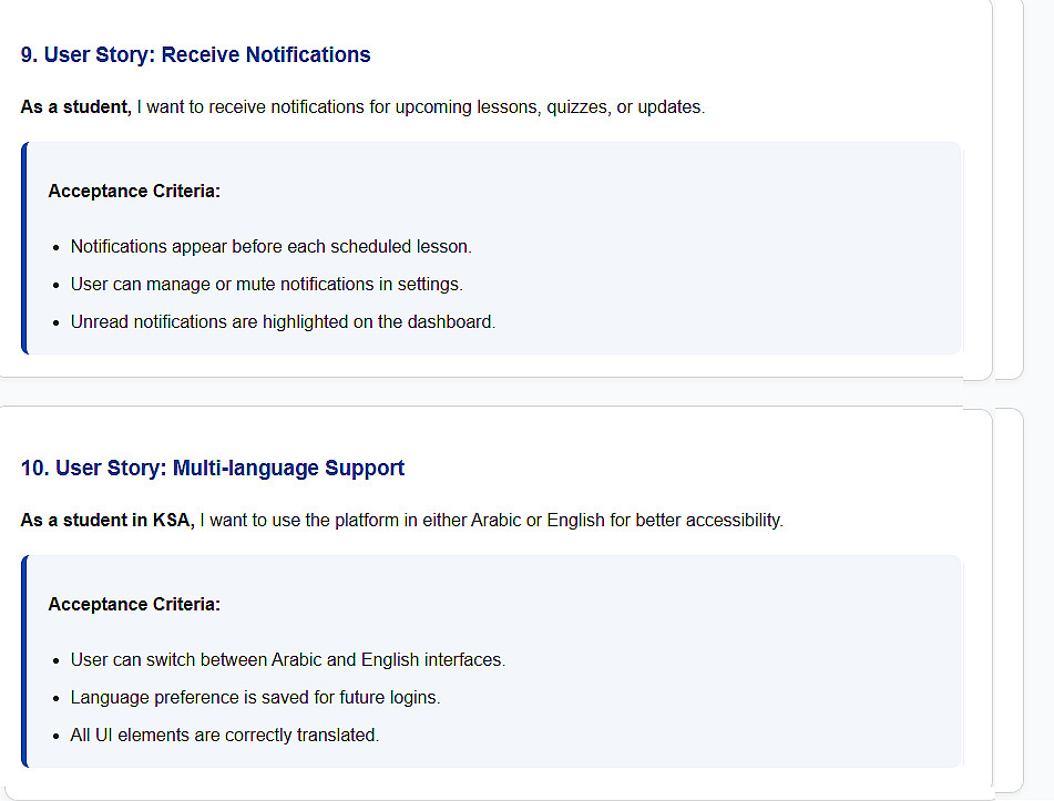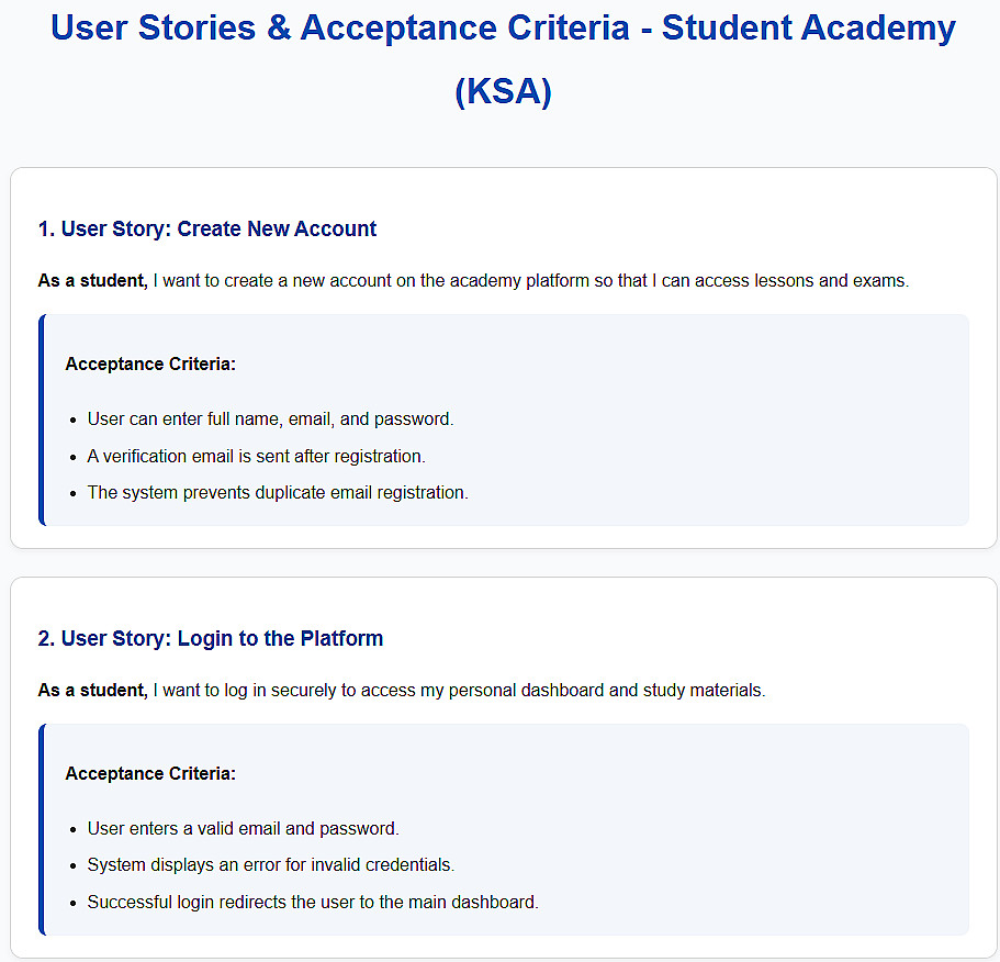 أقدِّم لك خدمة كتابة قصص المستخدم ومعايير القبول بلغة عربية فصحى واضحة ومنسقة، تساعدك على تحويل أفكارك إلى وثائق قابلة للتنفيذ داخل أي مشروع برمجي.