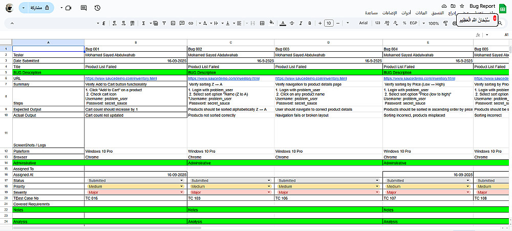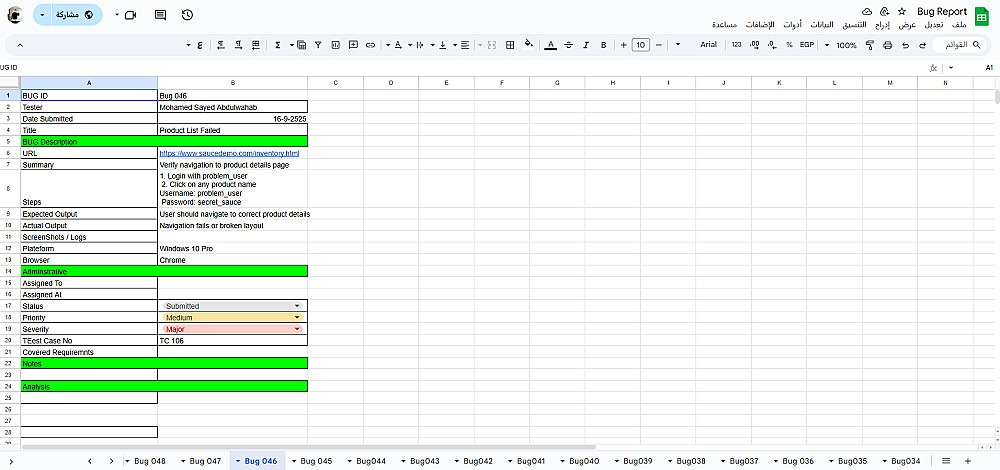 توثيق الأخطاء مع لقطات شاشة وخطوات إعادة الإنتاج.