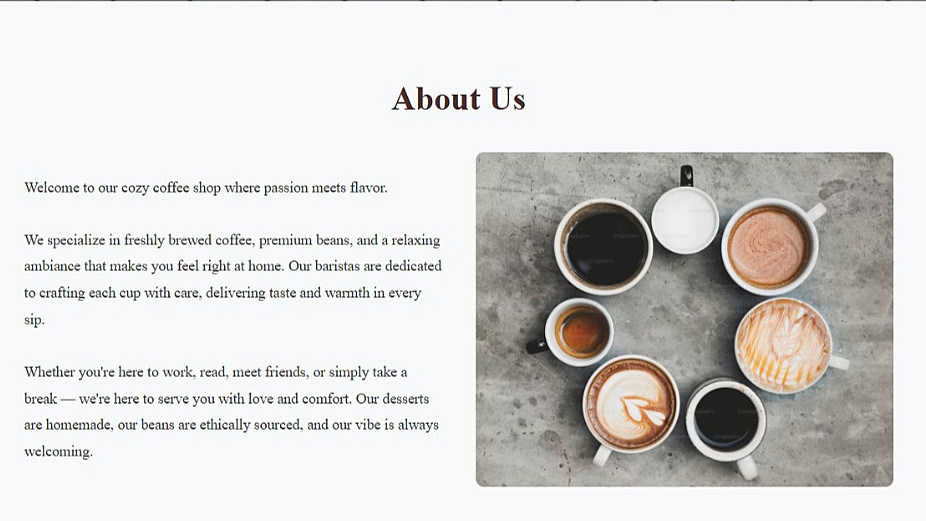 ـ صفحة هبوط مكونة من أربع أقسام (هيدر ـ عنا ـ المنيو ـ تواصل معنا)