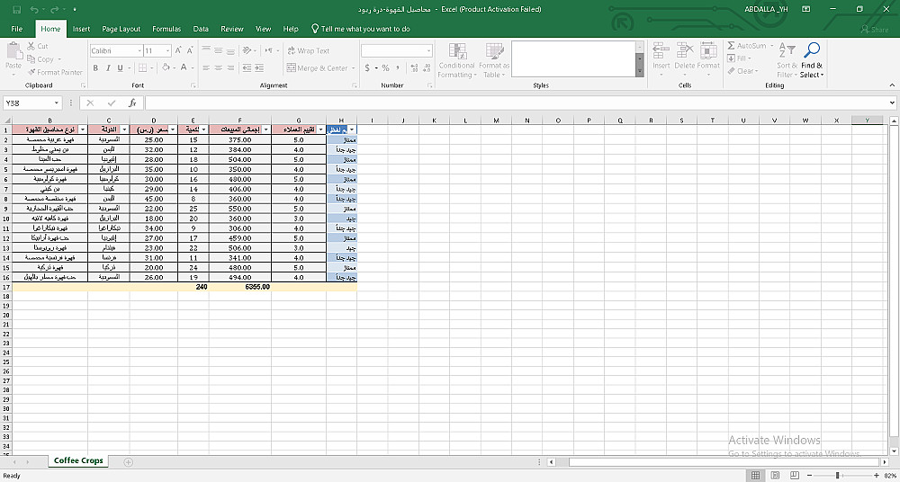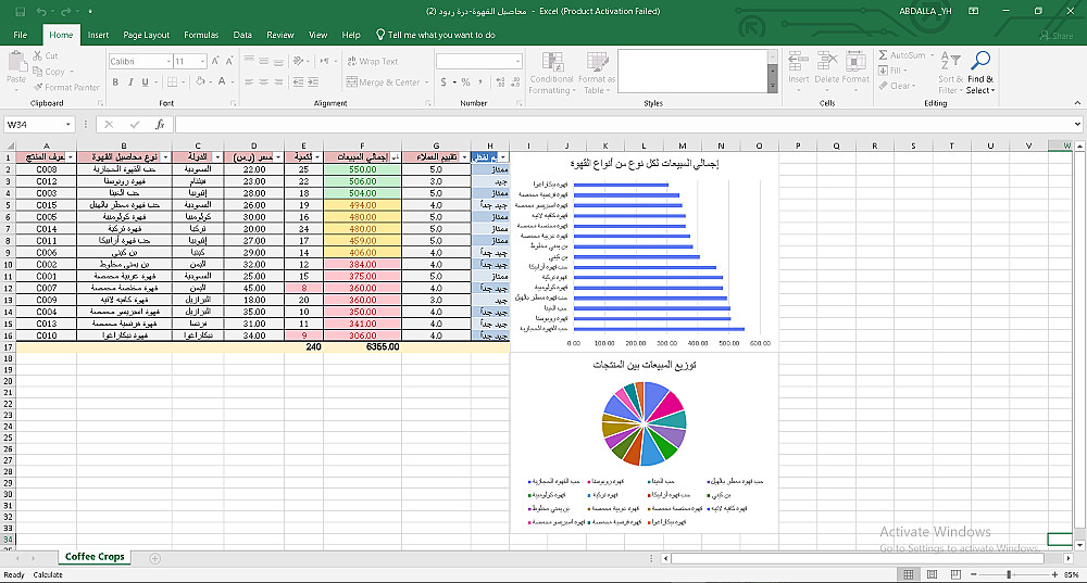 تحليل البيانات وتصور بيانات محصول البن في اكسيل