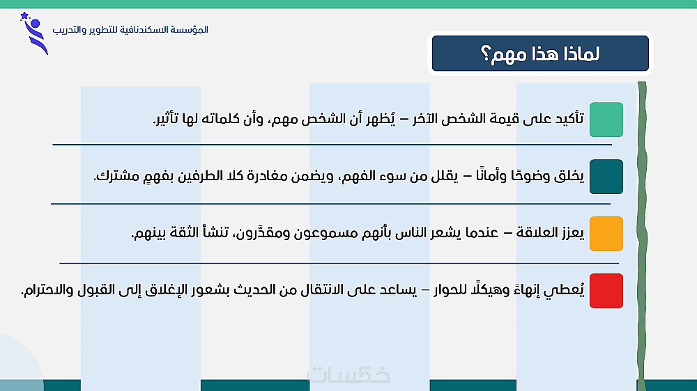 أركز على عرض المعلومات بأسلوب بسيط ومنظم، يسهِّل على الحاضرين والمتلقين فهم النقاط الرئيسية بدون زحمة أو تشتيت.