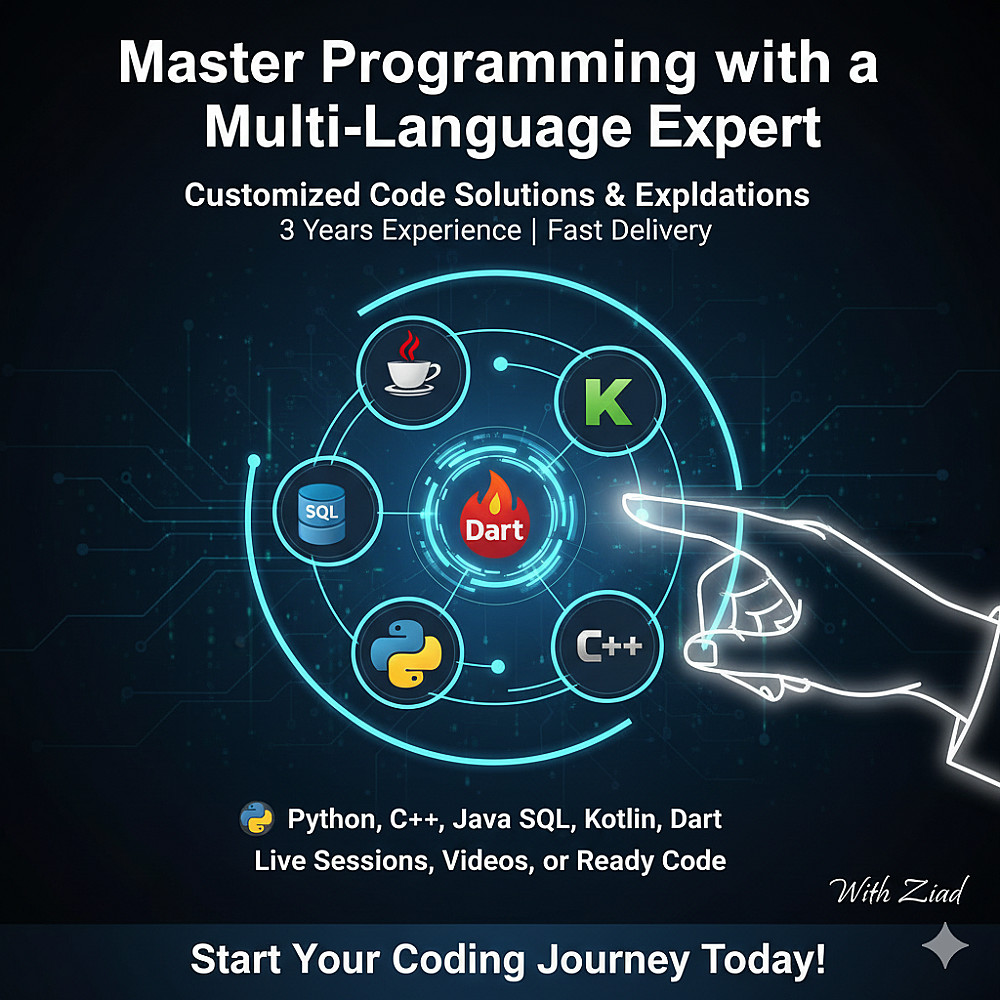 أمتلك خبرة واسعة في لغات برمجة متعددة مثل Python, C++, Java, SQL, Kotlin, و Dart، مما يسمح لي بتقديم حلول دقيقة وموثوقة.