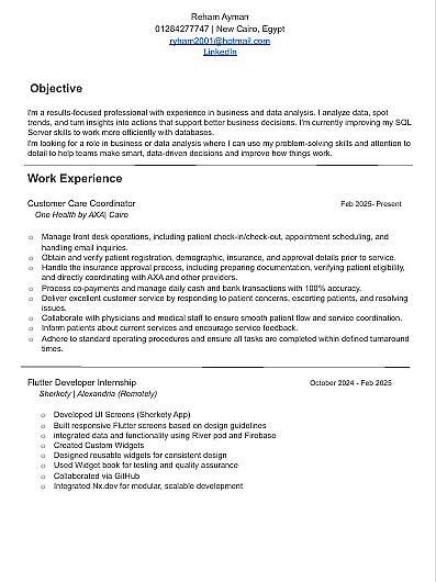أنا متخصصة في كتابة وتصميم السير الذاتية الاحترافية (CV) باللغتين العربية والإنجليزية، بطريقة تبرز نقاط قوتك وتزيد فرصك في القبول الوظيفي.