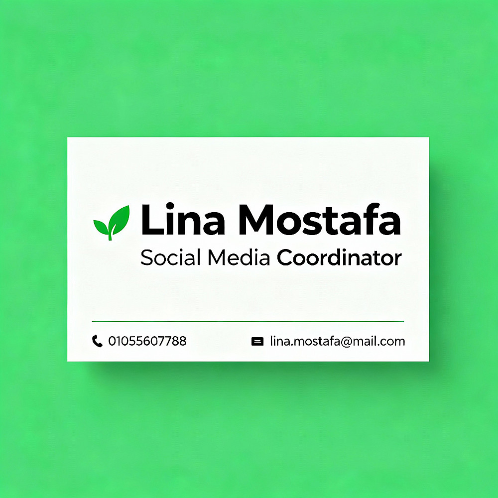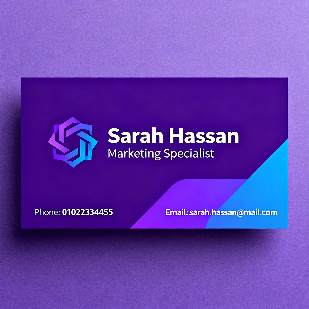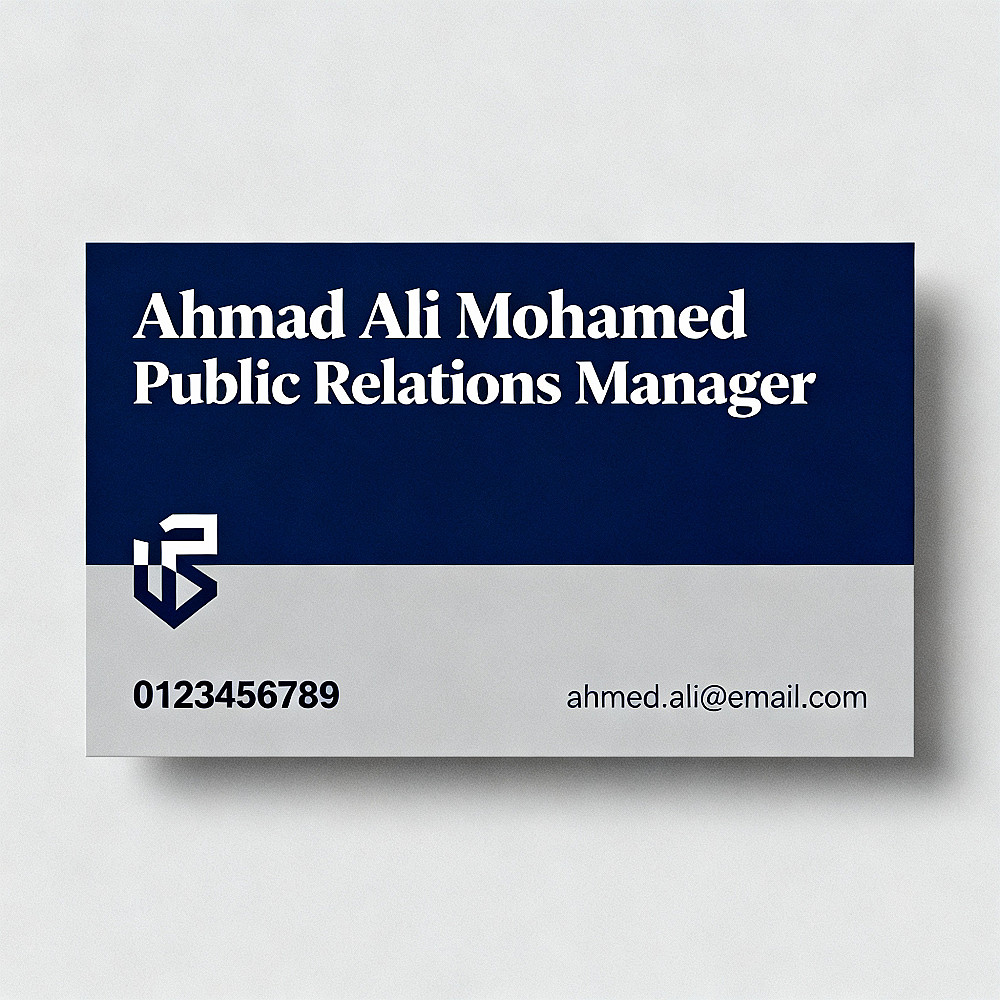 أقدّم لك تصميم بيزنس كارد مميز ومتقن يدعم نشاطك التجاري أو الشخصي باللغتين العربية أو الإنجليزية حسب رغبتك.