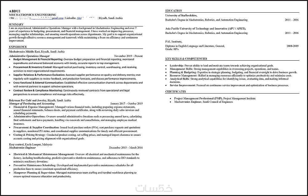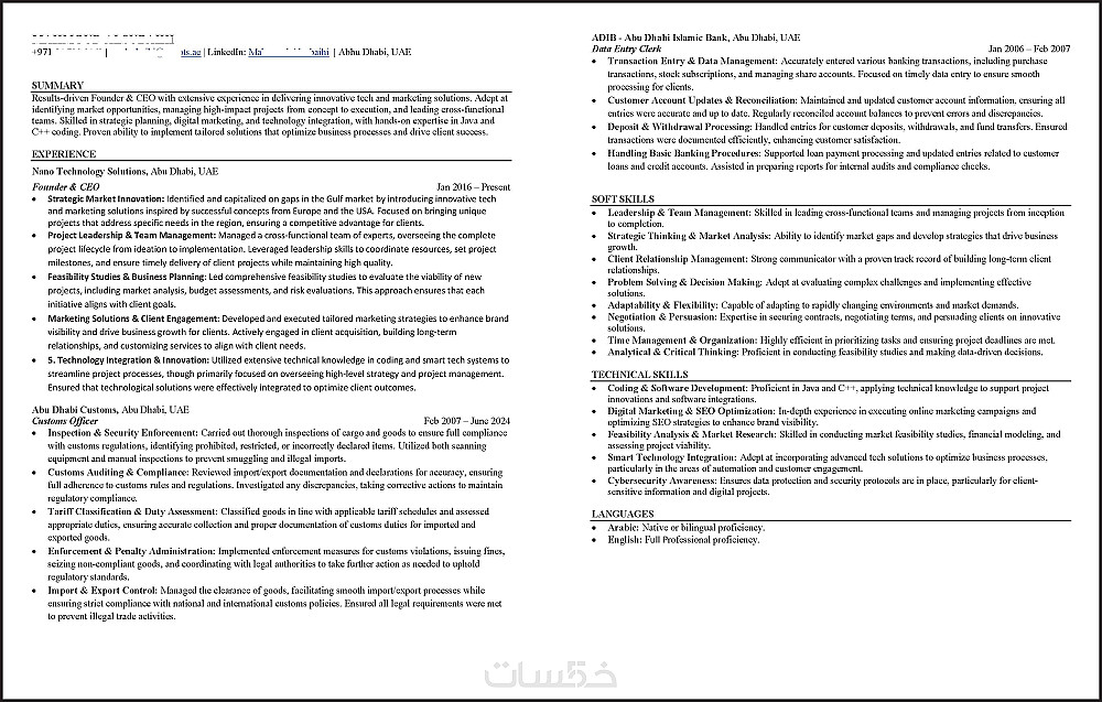 احصل الآن على سيرة ذاتية، بلغة واحدة (الإنجليزية أو العربية) في (صفحة واحدة او اثنين) حسب اختيارك.