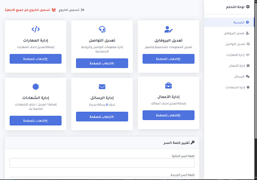لوحة تحكم محمية بكلمة سر لتتمكن من تعديل الموقع بنفسك، إضافة أو إخفاء أي قسم، وتحديث البيانات بسهولة.