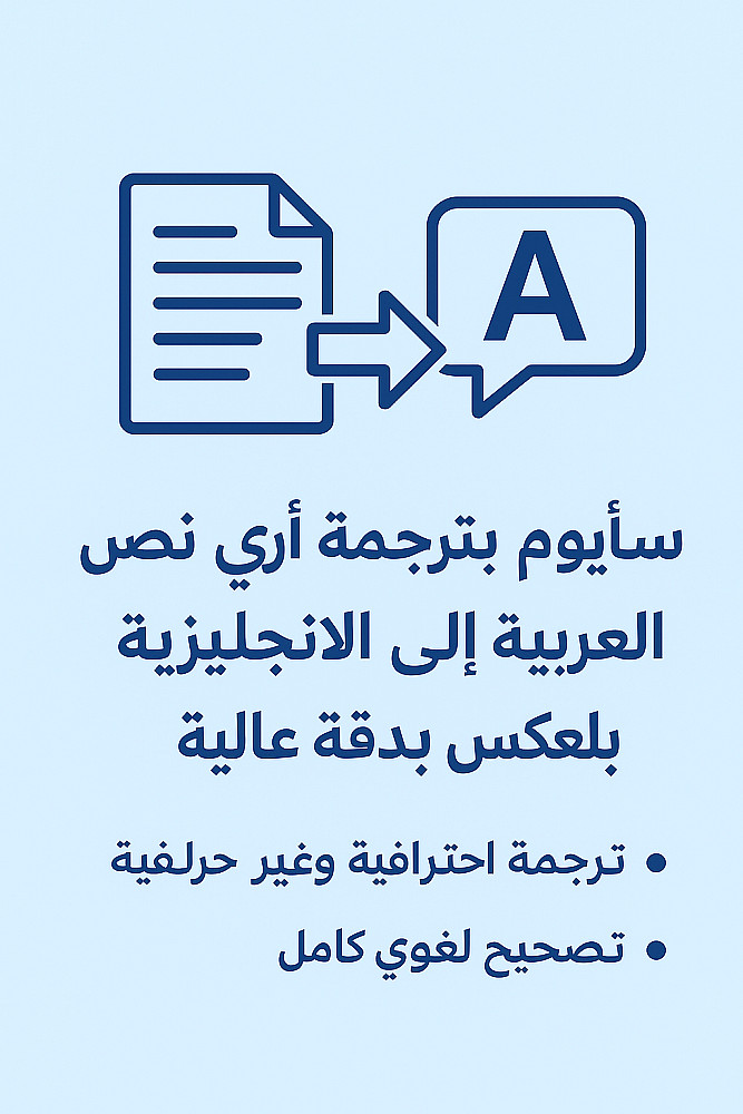 سأقوم بترجمة النصوص من العربية إلى الإنجليزية وبالعكس بدقة عالية كل 500 كلمة ترجمة ب 5$