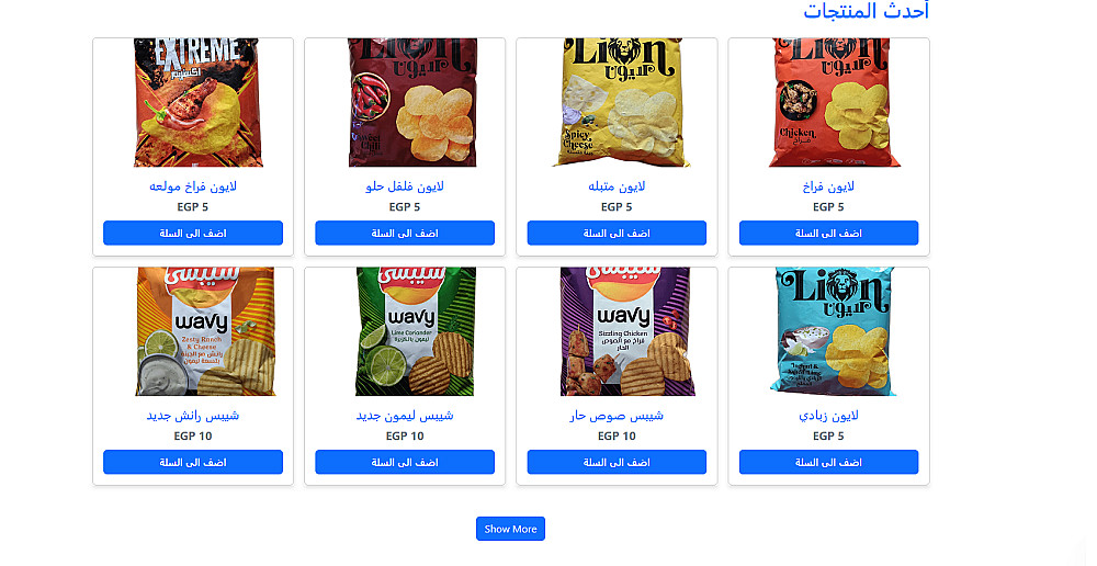 تعرض جميع المنتجات مع تصنيفات (مثل: خضروات، فواكه، مشروبات، منظفات، إلخ) مع صور وأسعار وأزرار “أضف إلى السلة”.