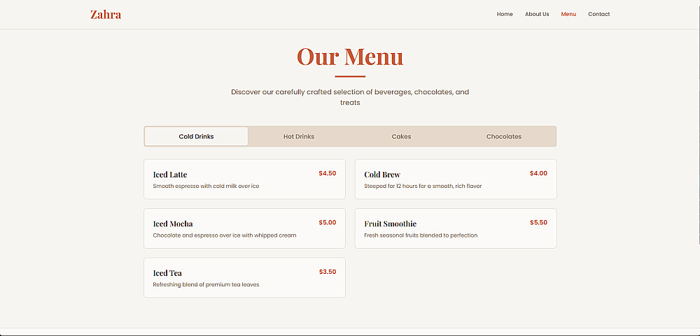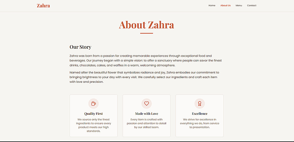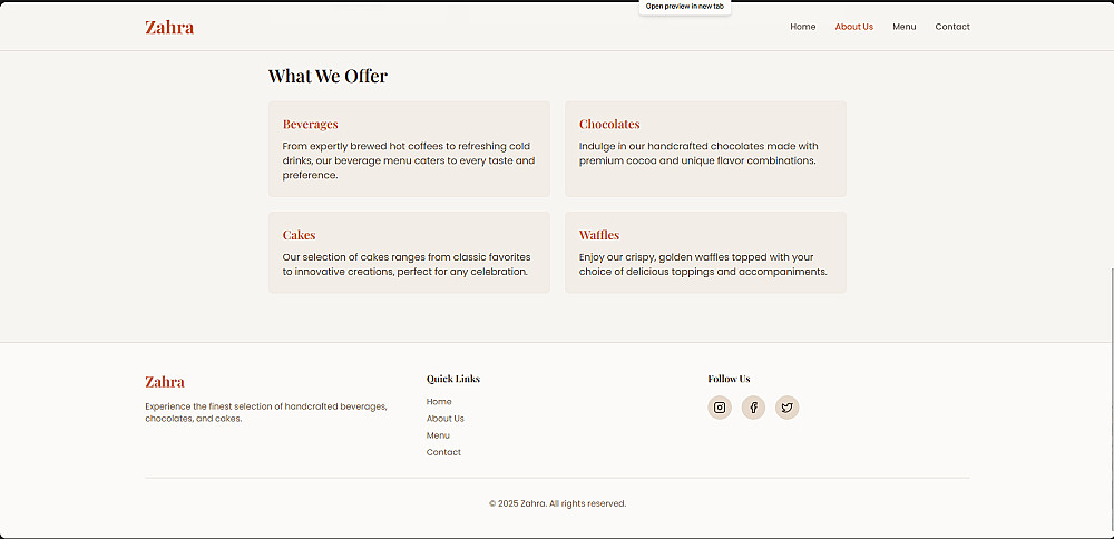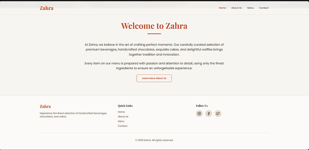 صفحات يمكن إنشاؤها لك:الصفحة الرئيسية (Home)-من نحن (About)-الخدمات أو المنيو (Menu / Services)-صفحة التواصل (Contact)