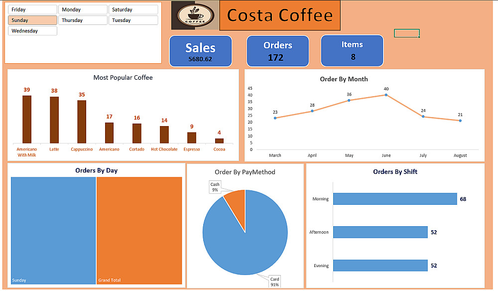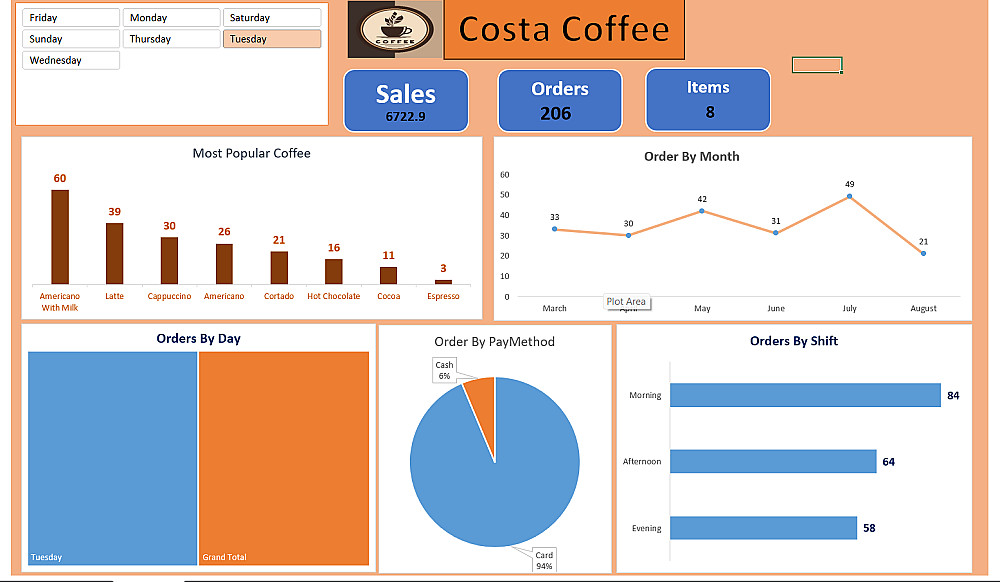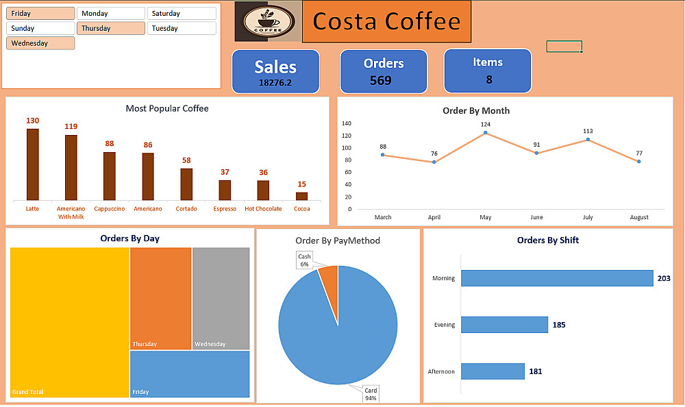 نموذج لوحة تحكم احترافية (Excel Dashboard) – مشروع Costa Coffee