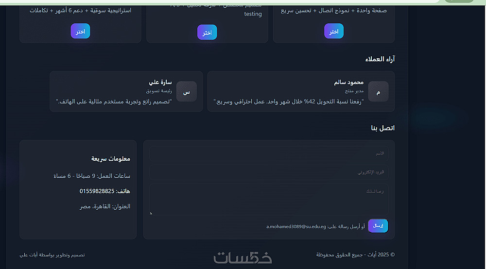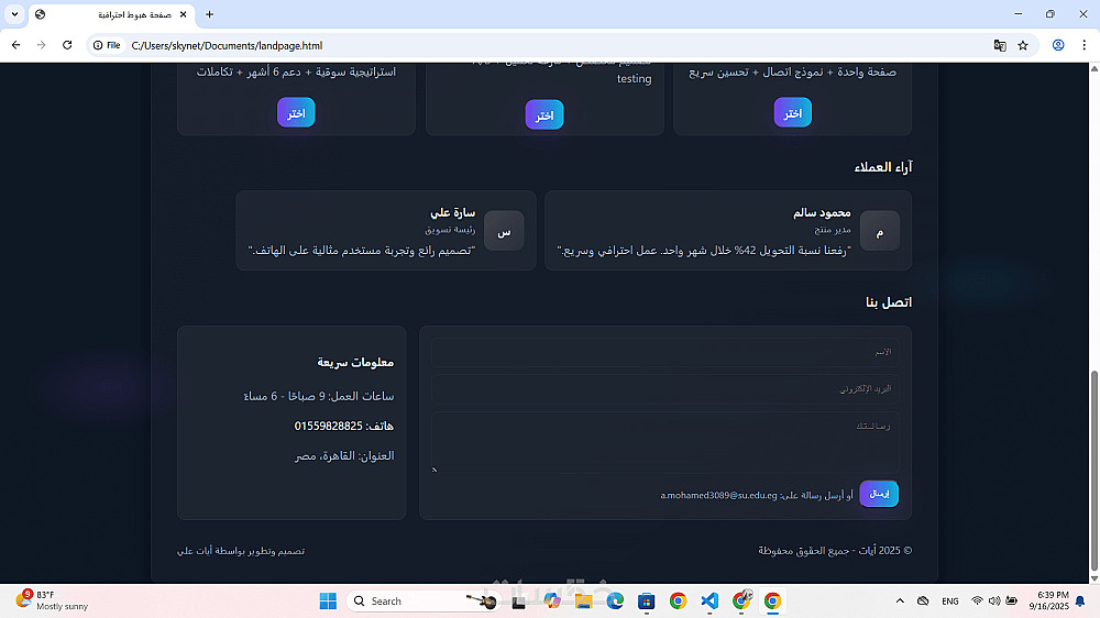 أقدّم لك صفحة هبوط احترافية مصمّمة خصيصًا لتحويل الزوار إلى عملاء. التصميم متجاوب ويعمل بكفاءة على الهاتف والحاسوب، مع تركيز على سرعة التحميل وتجربة المستخدم (UX) وأزرار CTA واضحة.