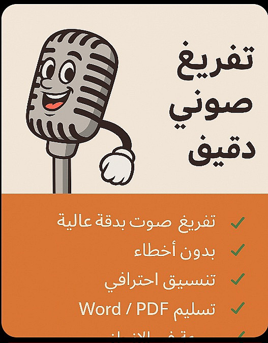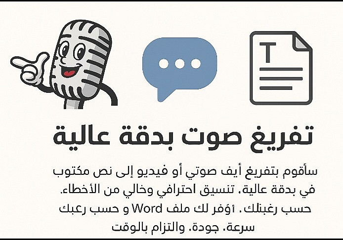 > سعر الخدمة يشمل تفريغ 10 دقائق من الصوت أو الفيديو بدقة عالية وبدون أخطاء.