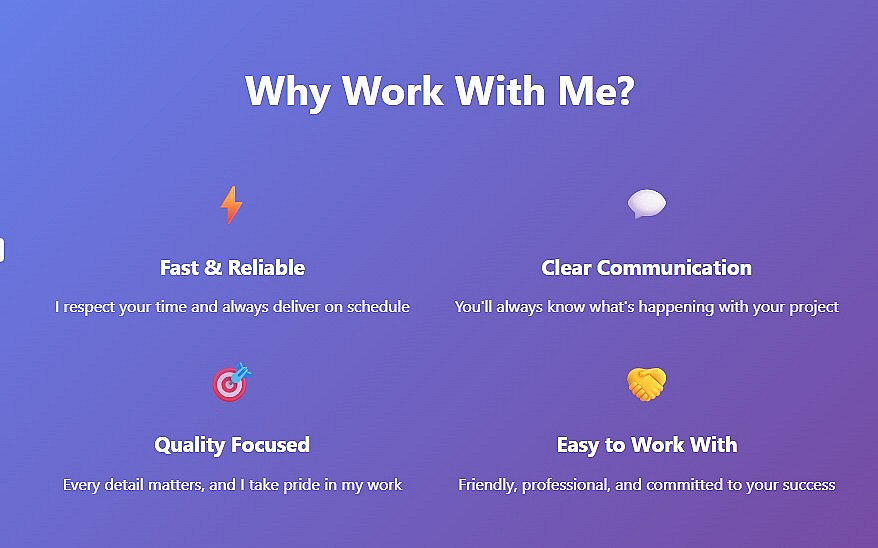 سواء كنت تريد الترويج لمنتج، خدمة، حدث، أو جمع بيانات العملاء، سأضمن لك صفحة هبوط احترافية تساعدك على تحقيق أهدافك بسرعة وكفاءة.