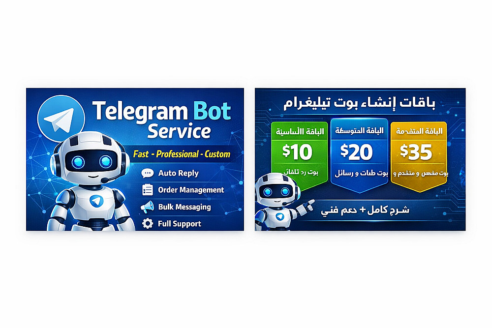 أقدّم خدمة إنشاء بوت تيليغرام احترافي حسب احتياجاتك، مناسب للتجّار، القنوات، الصفحات، والمشاريع الصغيرة.
