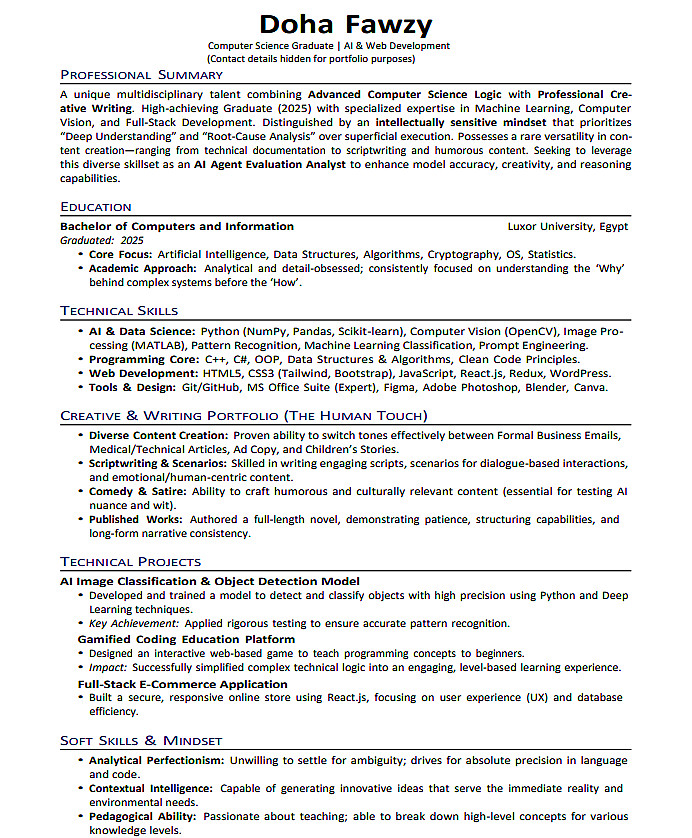 أنا أقدّم لك خدمة إنشاء سيرة ذاتية مخصصة (Customized CV) وليست مجرد قوالب جاهزة، بل يتم بناؤها خصيصًا لك لتجعل أصحاب الشركات ومسؤولي التوظيف يتوقفون عند اسمك، ويشعرون أنك المرشح المناسب قبل حتى مقابلتك.