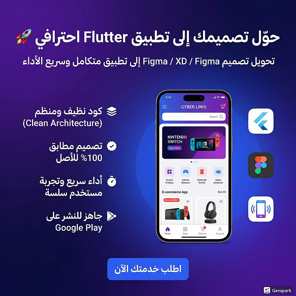 أقدّم لك خدمة تحويل تصميمات UI (Figma – Adobe XD – صور) إلى تطبيق Flutter احترافي بكود نظيف ومنظم، مطابق للتصميم بنسبة 100% وجاهز للنشر أو التطوير لاحقًا.