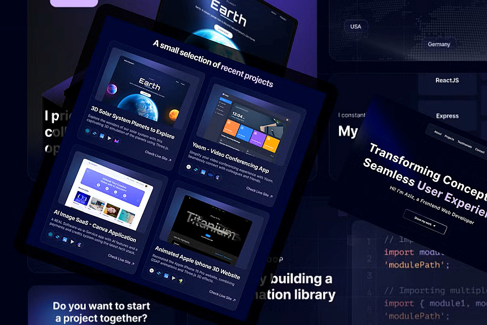 الواجهة (Home): تصميم عصري يحتوي على اسمك، المسمى الوظيفي، نبذة مختصرة، وصورتك الشخصية بتأثير إضاءة احترافي.