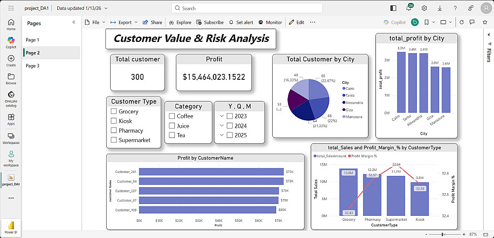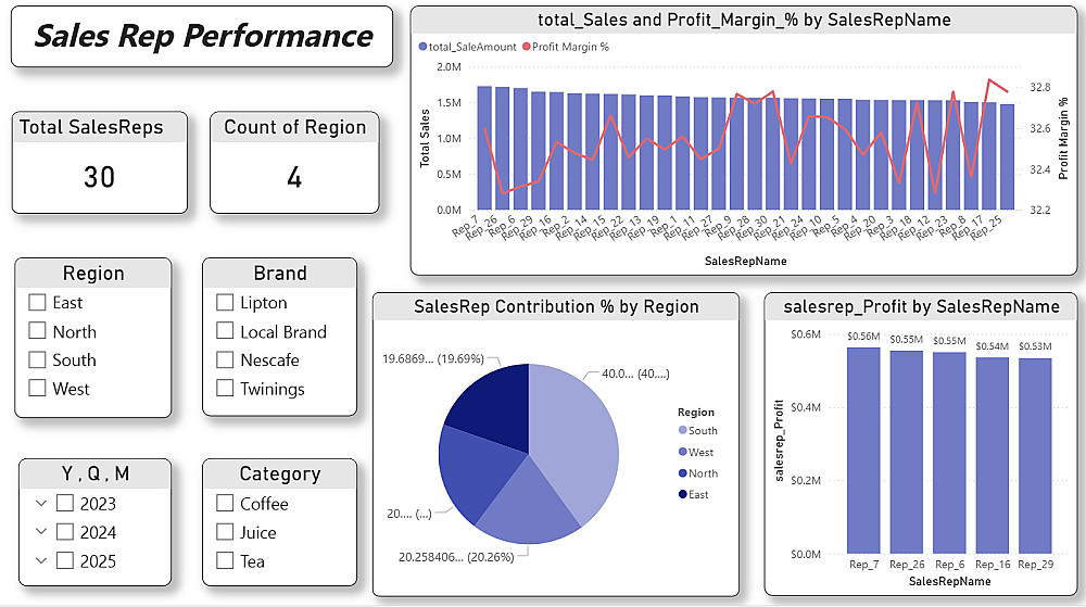 في هذا المشروع قمت بتحليل بيانات مبيعات كاملة وبناء نموذج بيانات احترافي باستخدام أسلوب Star Schema لربط جدول العمليات (Fact Sales) بجداول الأبعاد (Customer – Product – SalesRep – Date).