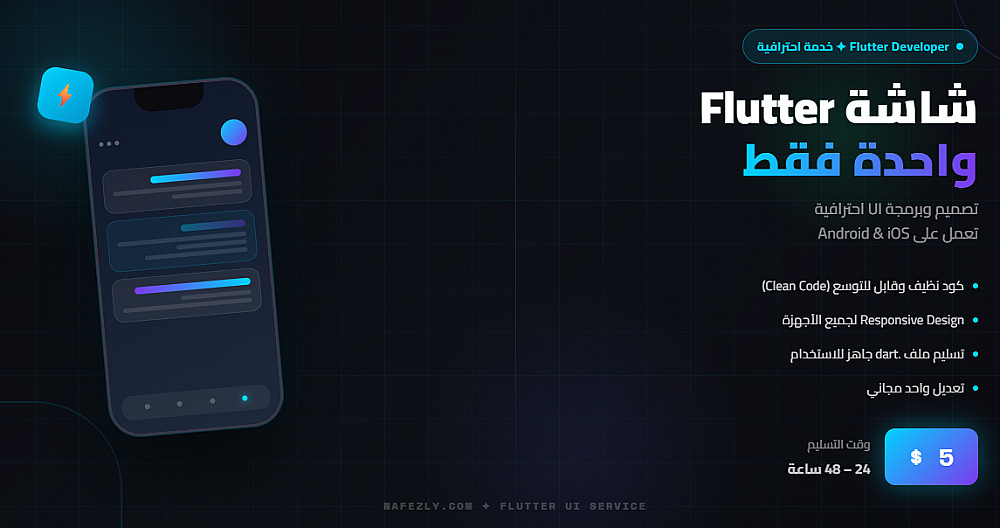 أقدم لك خدمة تصميم وبرمجة شاشة Flutter واحدة تعمل على Android وiOS بكود نظيف وقابل للتوسع.