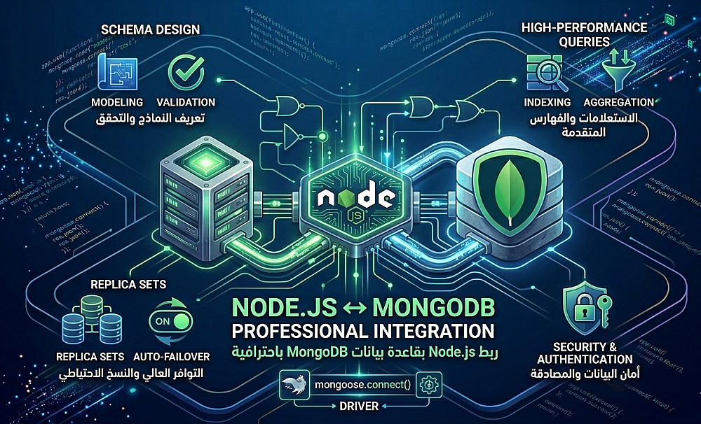سأقوم بربط تطبيق Node.js بقاعدة بيانات MongoDB باحترافية وتنظيم كامل