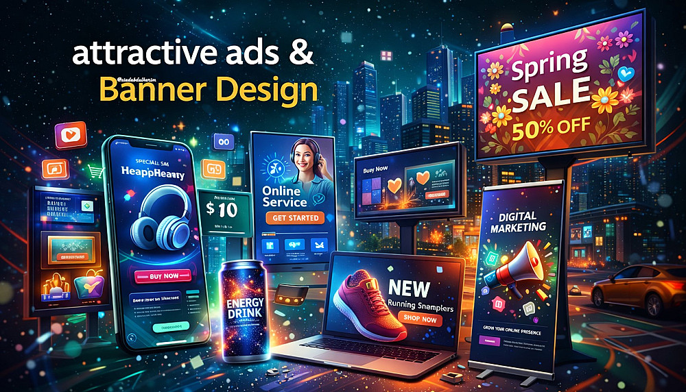 لو محتاج إعلان يلفت نظر الناس أو بانر يعبر عن علامتك التجارية بشكل مميز، أقدر أصممهولك بشكل عصري وجذاب.