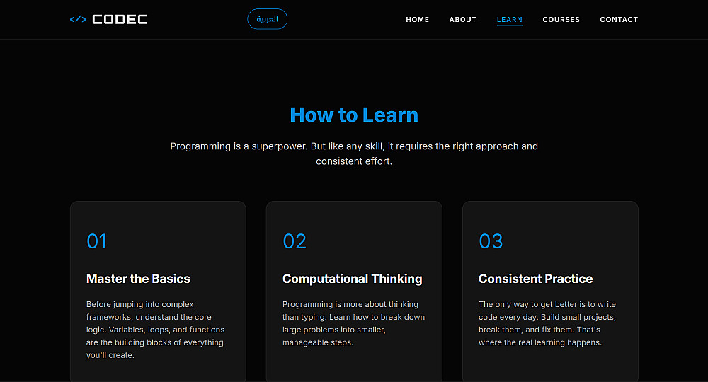 ملاحظة: الخدمة تشمل برمجة الواجهة الأمامية (Front-end) فقط بدون لوحة تحكم، لتعديل المحتوى يتم من خلال الكود. يرجى مراسلتي قبل الطلب للاتفاق على التفاصيل!