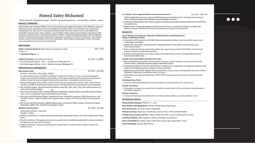أقدّم لك خدمة تصميم سيرة ذاتية احترافية ومنظمة باللغتين العربية والإنجليزية، متوافقة مع أنظمة تتبع المتقدمين (ATS)، ومناسبة لسوق العمل المحلي والدولي.