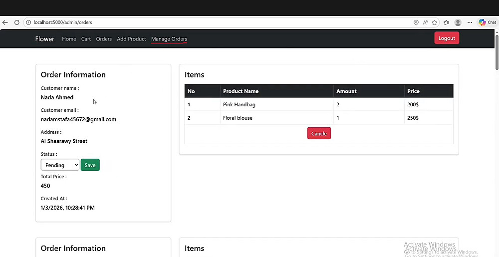 - لوحة تحكم للإدارة لإدارة المنتجات والطلبات