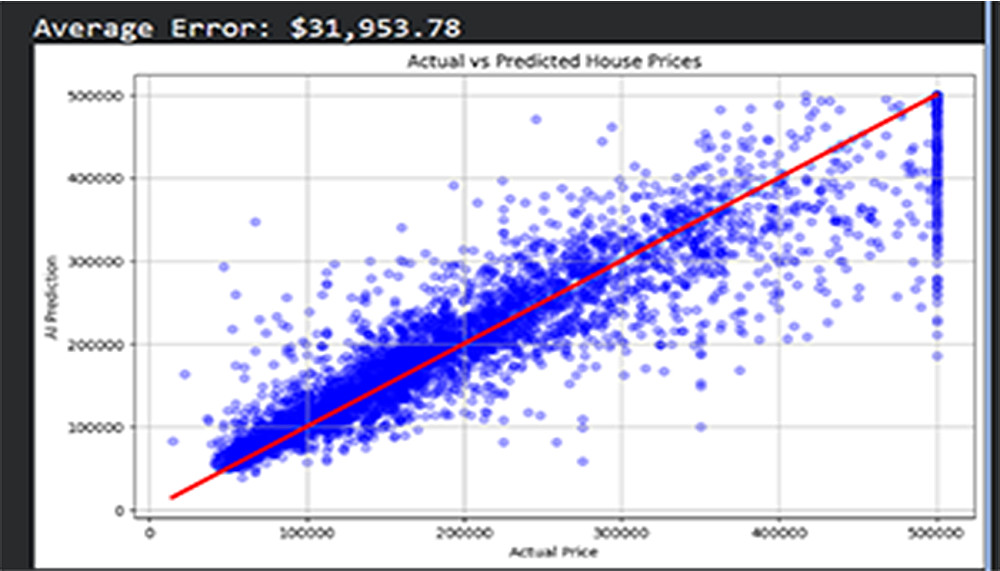 عرض مرئي (Visualization): توفير رسوم بيانية (Scatter Plots) توضح العلاقة بين القيم الحقيقية وتوقعات الذكاء الاصطناعي.