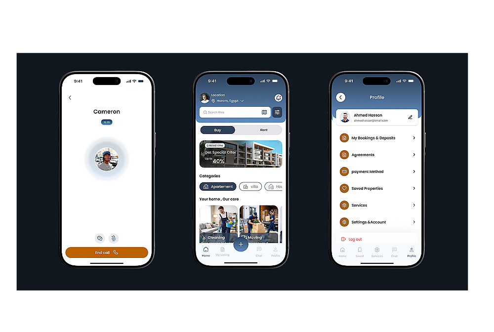 تصميم واجهة وتجربة مستخدم لتطبيق عقارات للبيع والإيجار مع خدمات متكاملة ونظام محادثة ذكي بالذكاء الاصطناعي