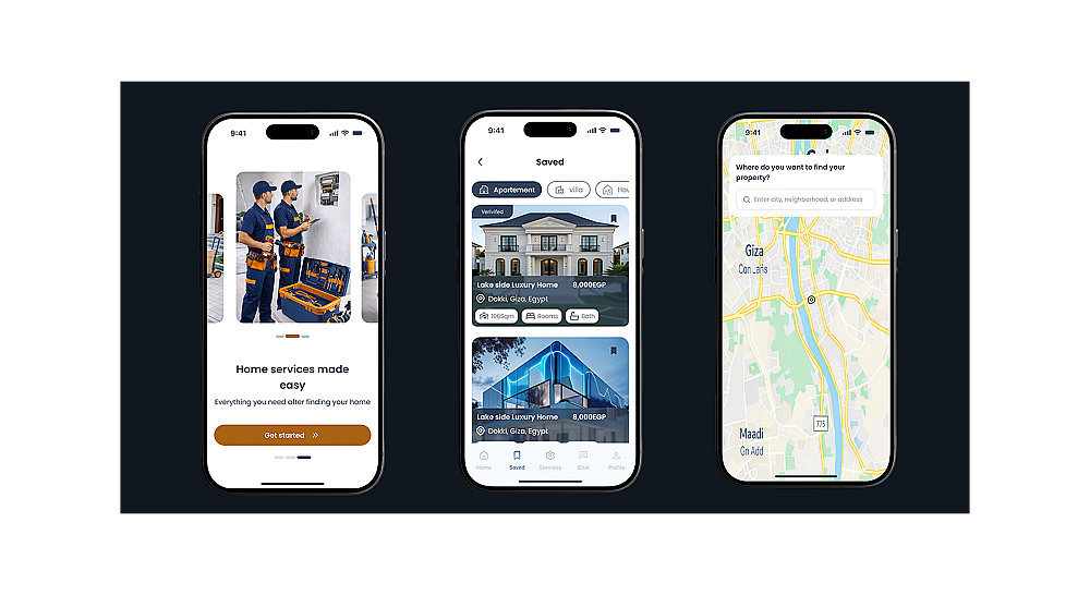أقدّم لك تصميم واجهة وتجربة مستخدم لتطبيق عقارات احترافي يشمل البيع والإيجار، مع خدمات متكاملة مثل الصيانة، التنظيف، والنقل. التطبيق مصمّم ليكون سهل الاستخدام وجذاب للمستخدم، مع حماية كاملة لبيانات العملاء لضمان الأمان والثقة.